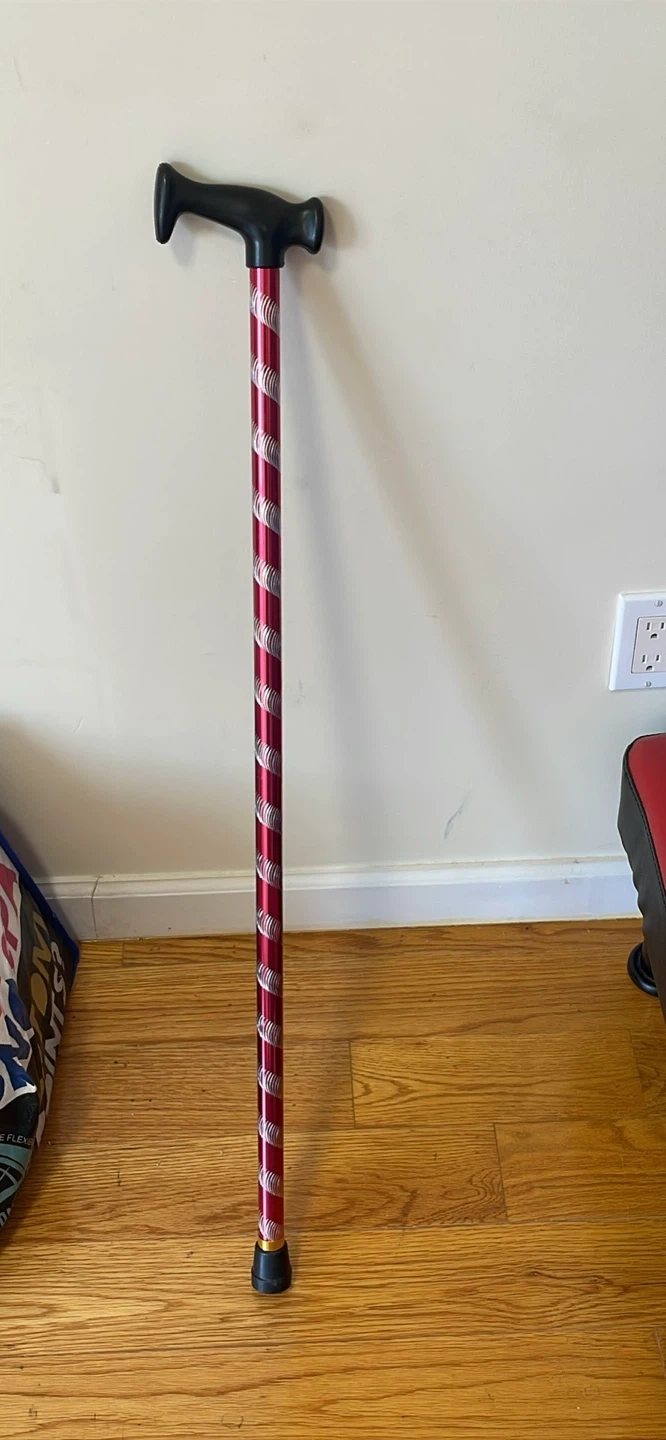 14Here is a red adjustable walking cane. It has a black handle and a decorative pattern. It's in great condition and ready to help you get around!