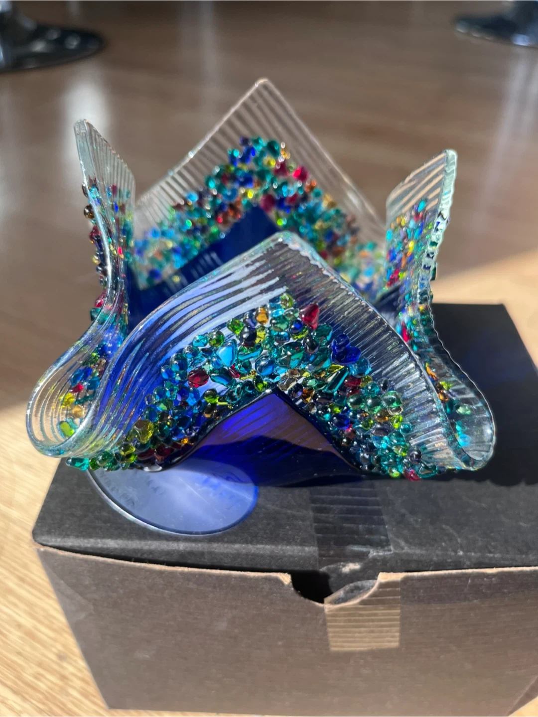 The candle holder features a beautiful design with colorful accents. Perfect for adding a touch of elegance to any room!
