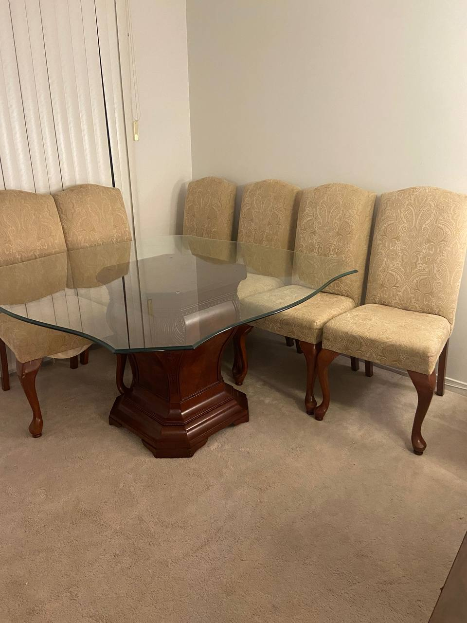Selling six dining chairs. The chairs have a lovely patterned fabric and wooden legs. Perfect for a dining room!