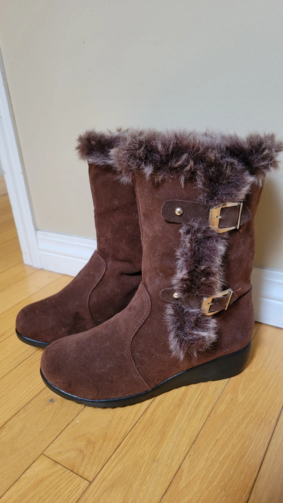 Cozy and stylish brown winter boots with faux fur trim. These boots feature buckle detailing and a comfortable wedge heel. They have soft and warm sheep skin like material inside lining to keep your feet warm and fashionable during the colder months!