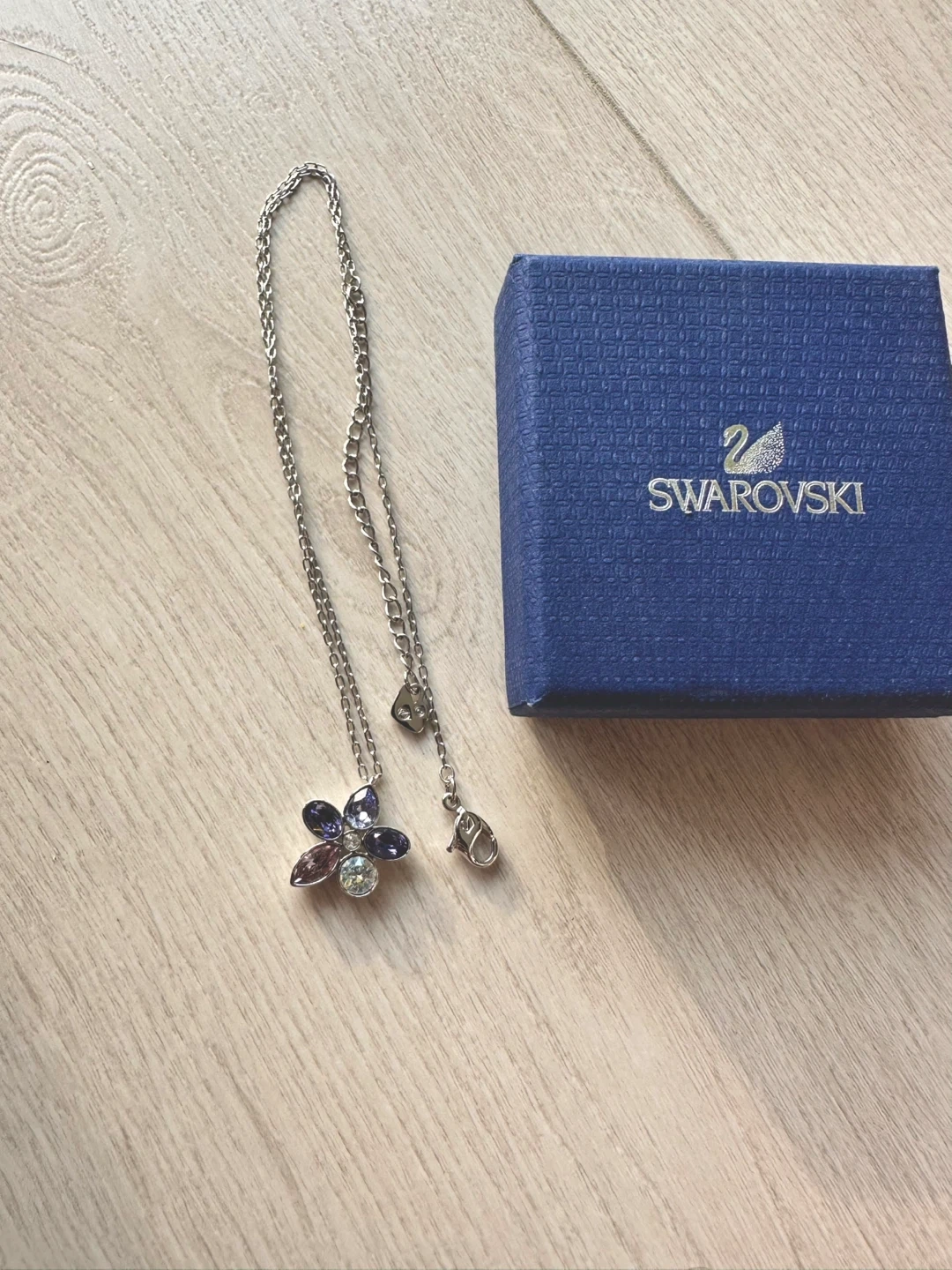 Selling a beautiful Swarovski necklace featuring a flower pendant with purple and clear crystals. It comes with its original box, perfect for gifting or safekeeping. The necklace has a delicate chain and a secure clasp. Never wore
