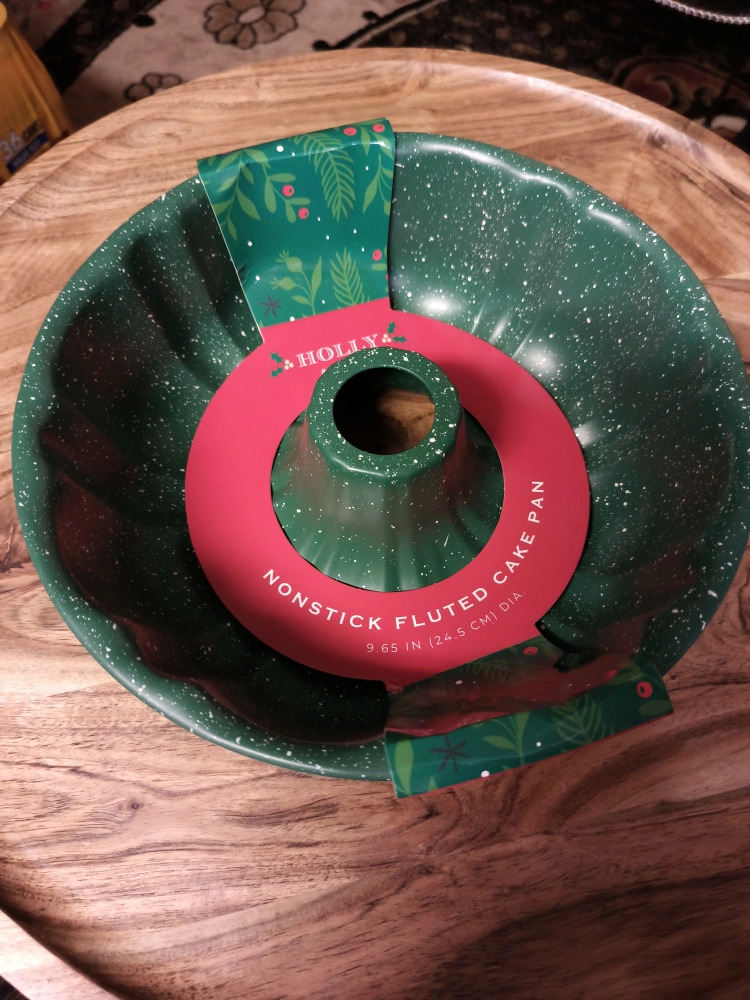 Selling a Holly & Moss nonstick fluted cake pan. It's green with white speckles and has a durable carbon steel construction. It's oven safe to 425°F and has a nonstick coating for easy cleanup. The pan is 9.65 in (24.5 cm) in diameter
