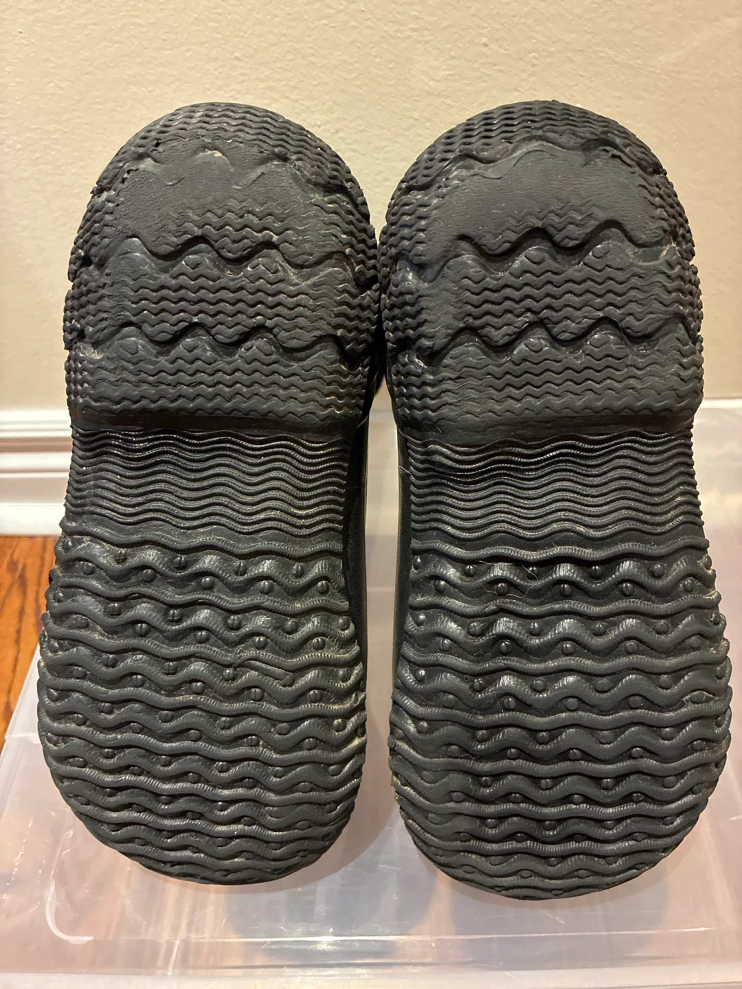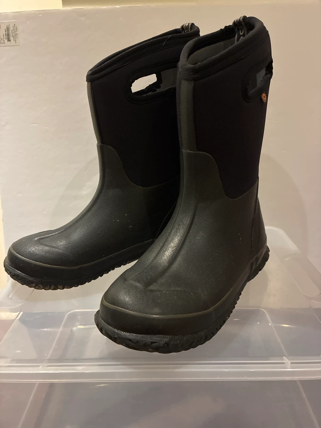Here are some Bogs Kids' Classic High Waterproof Boots. They are black and in good condition, ready for some puddle jumping! Size 4 US.