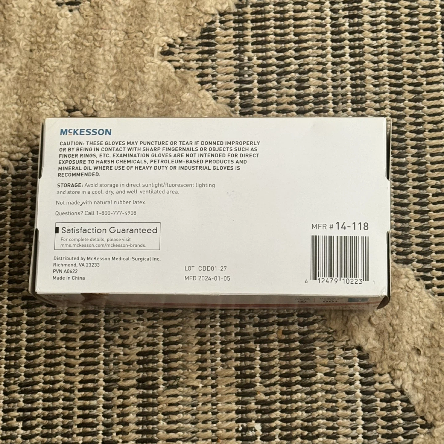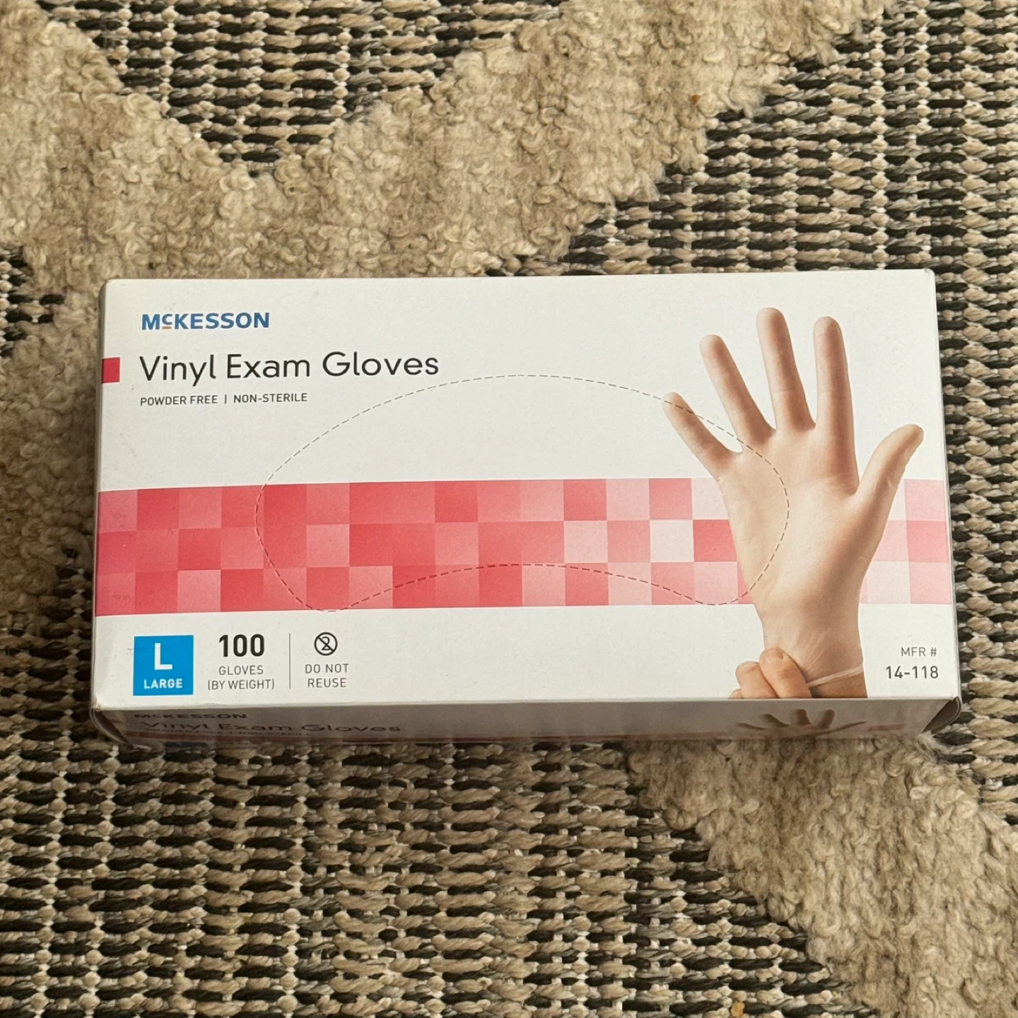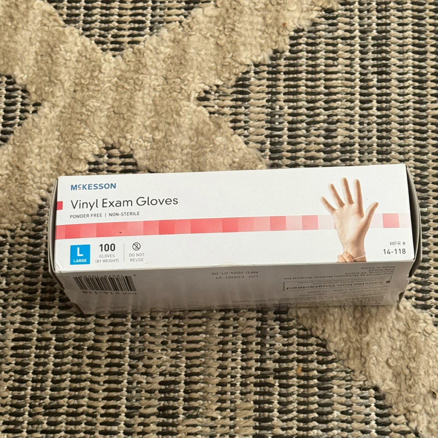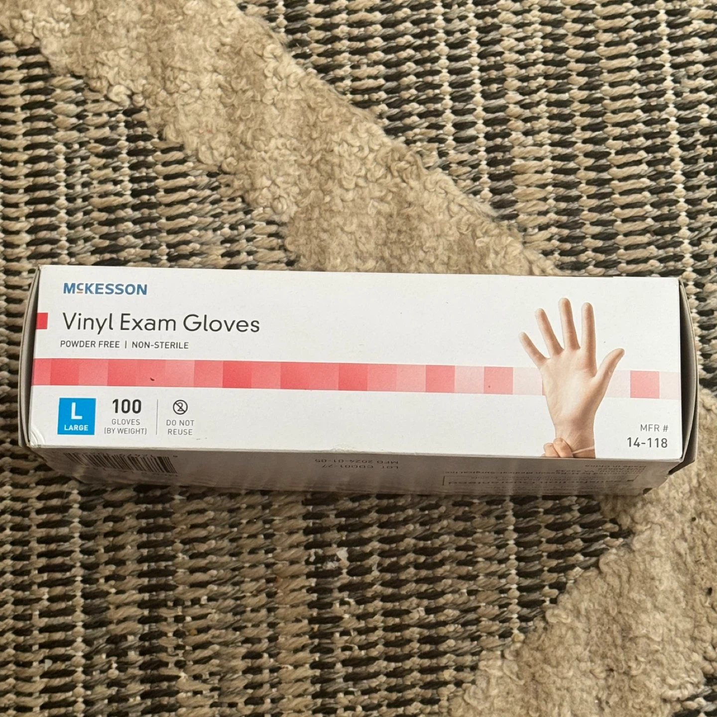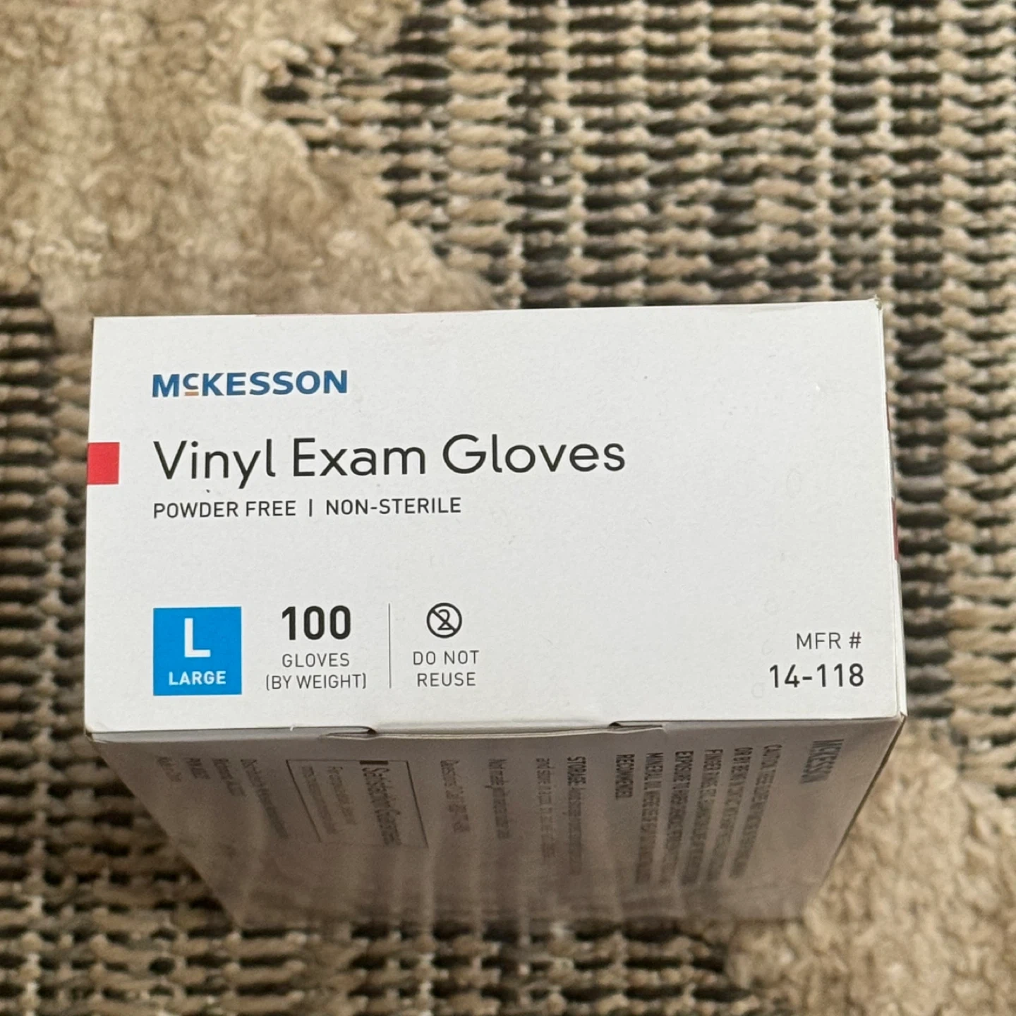 Selling a box of McKesson Vinyl Exam Gloves, size Large. The box contains 100 powder-free and non-sterile gloves. The manufacturing date is 2024 January 05. Pickup is by Schaumburg and Barrington Road in Schaumburg IL 60194 right behind the Schaumburg Home Depot there. Buy 1 for $6 or 2 for $10.