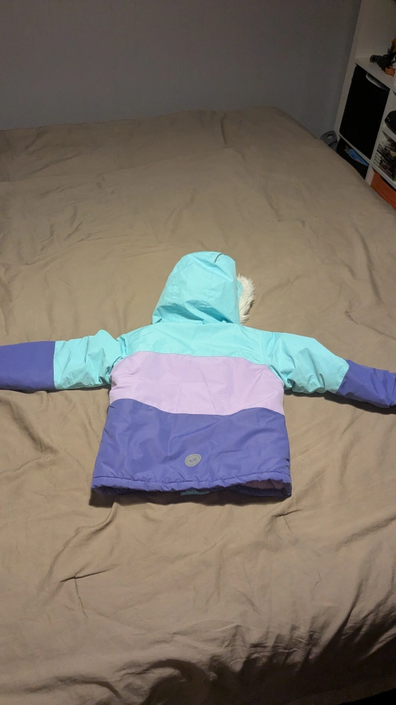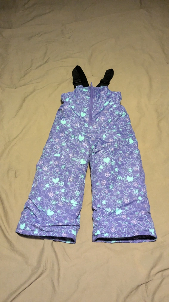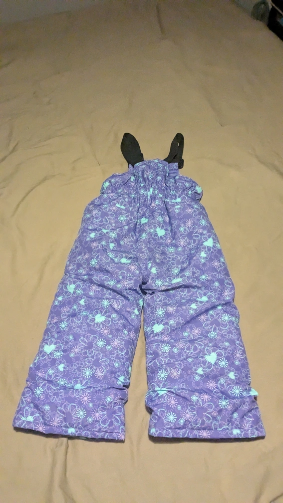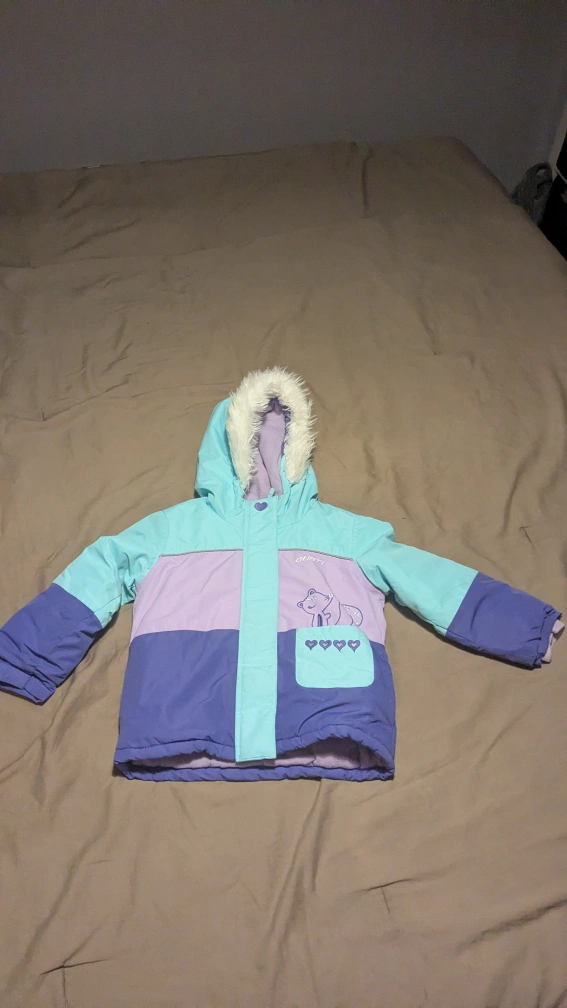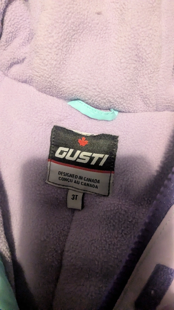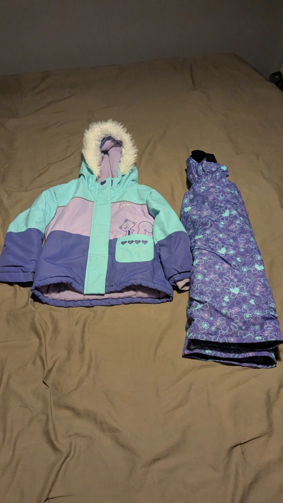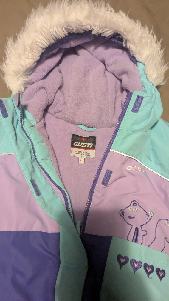 Gusti winter set for sale, size 3T! The set includes a jacket and snow pants, perfect for keeping your little one warm and cozy this winter season. The jacket features a hood with fur trim and a cute squirrel design. The colours are a lovely mix of blue, purple, and lavender