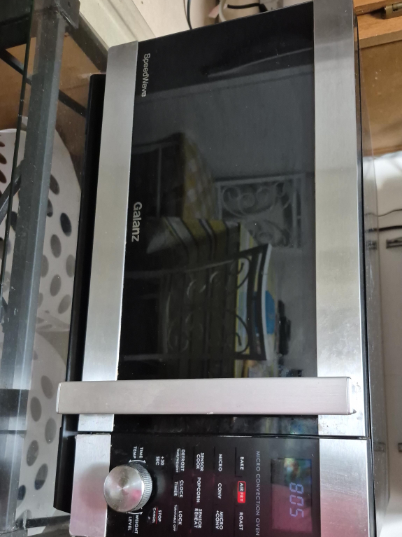 Selling a Galanz SpeedWave micro convection oven. It has bake, air fry, and roast functions. Also features sensor cook, popcorn, and sensor reheat options. The control panel includes defrost, clock, timer, and a turntable on/off setting