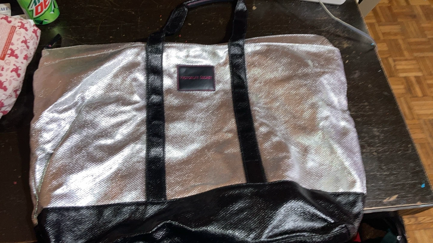 Selling a Victoria's Secret tote bag in silver and black. It's in great condition and perfect for carrying all your essentials. The interior is spacious and lined with black fabric.