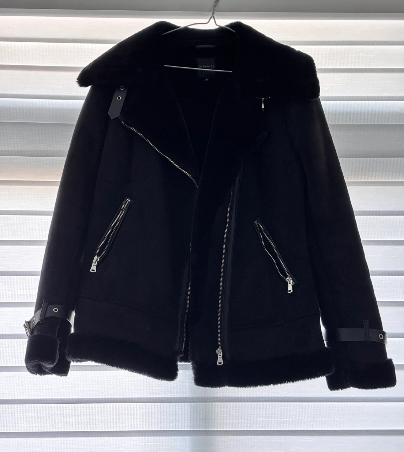Selling a stylish black faux shearling moto jacket! The jacket has a classic moto design with zipper details and buckle accents. Perfect for adding a bit of cool to your outfit!