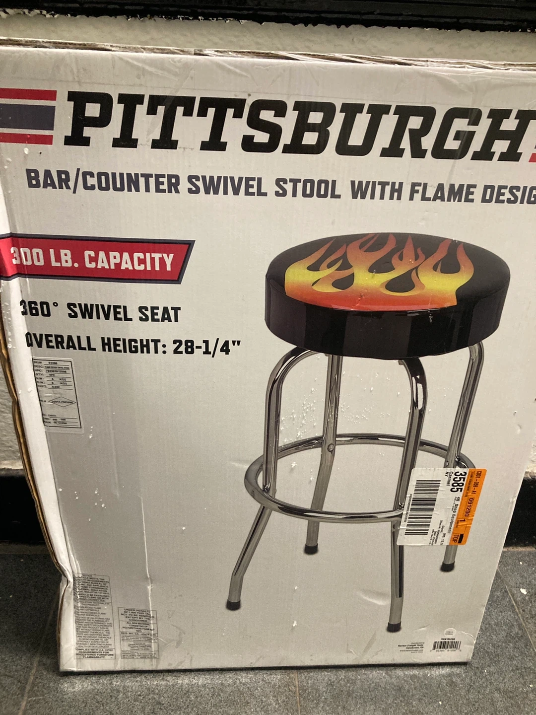 Selling a Pittsburgh bar/counter swivel stool with a cool flame design! It features a 360° swivel seat and has an overall height of 28-1/4". It can hold up to 300 lbs