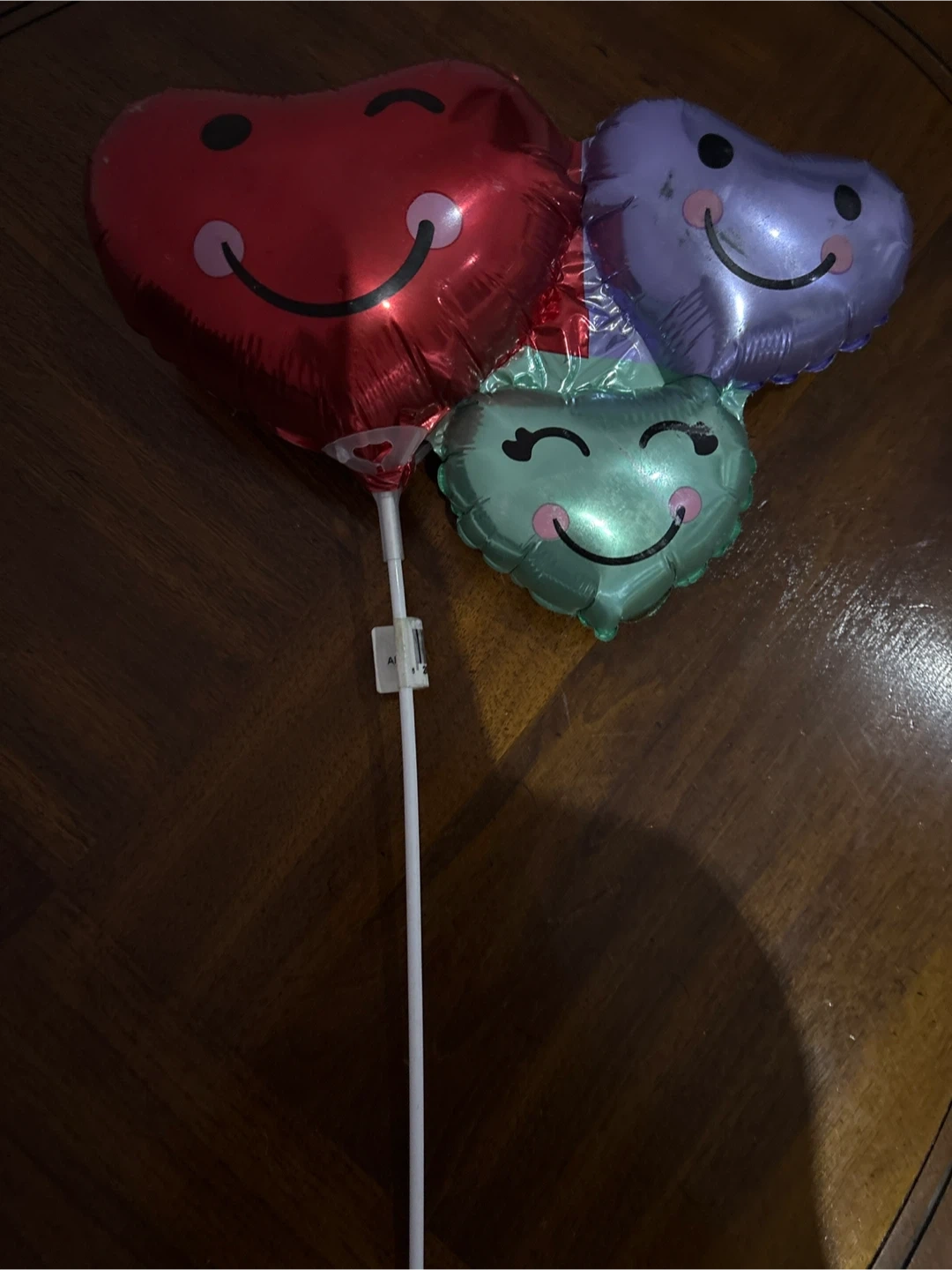 Selling a set of three heart-shaped balloons! They come in red, purple, and green, each with a cute smiley face. Perfect for a party or just to brighten someone's day