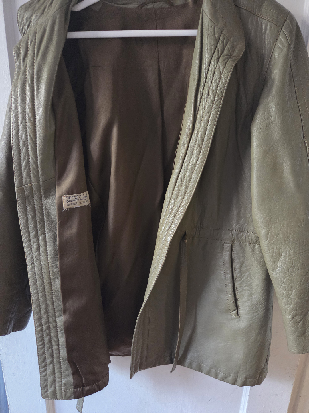 Selling a vintage leather jacket by Quality De Luxe. It's in good condition and has a unique olive green colour. A stylish piece to add to your wardrobe!