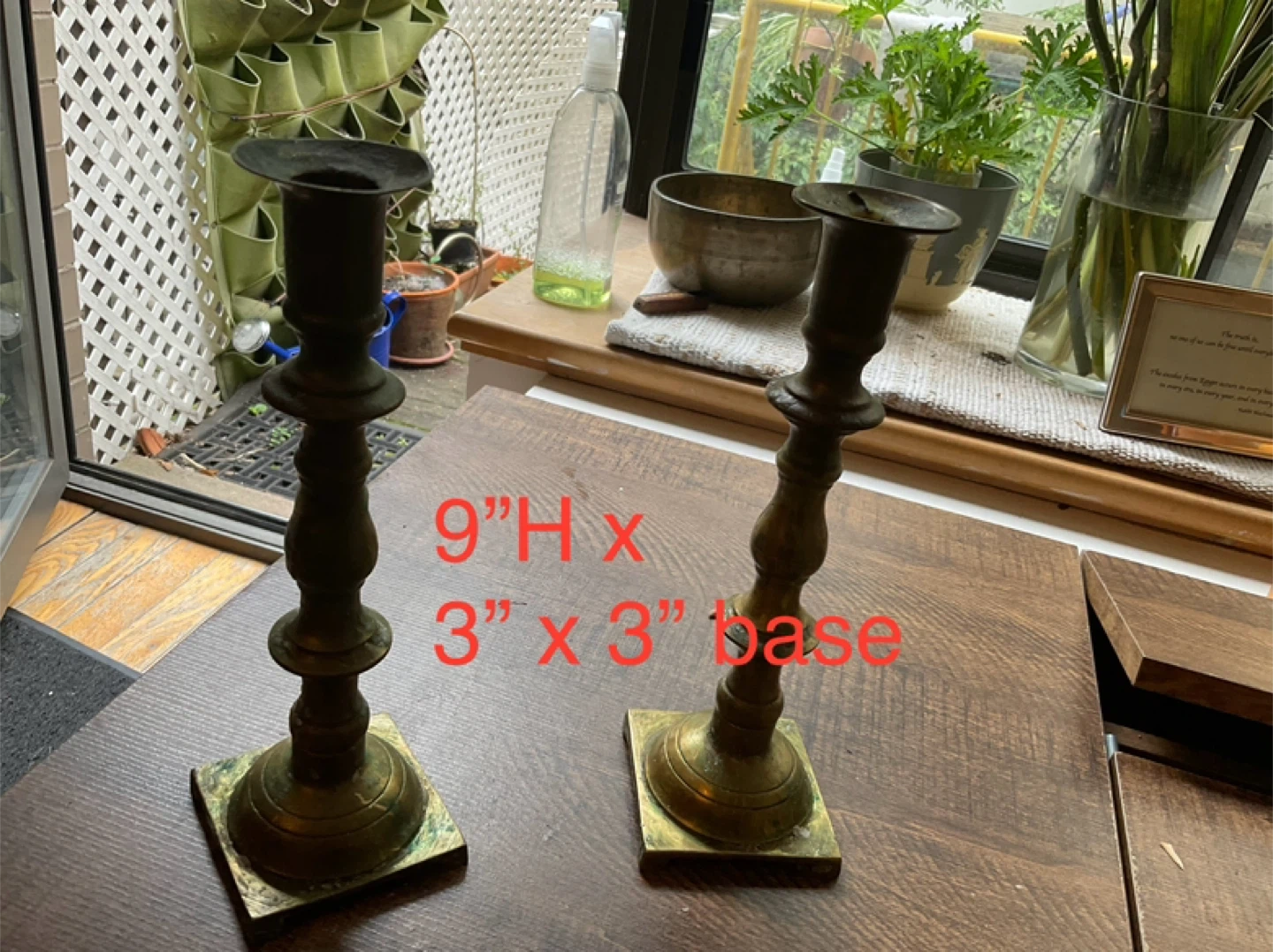16Selling a set of two vintage brass candlestick holders. They each stand 9 inches tall with a 3x3 inch base. Perfect for adding a touch of vintage charm to your home!