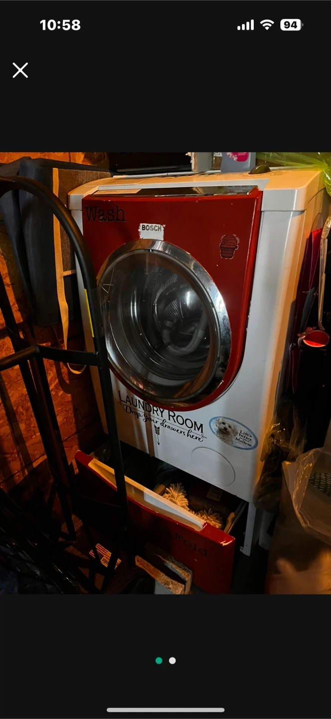 Selling a Bosch washing machine. It has a cute 'Laundry Room' decal and a 'Life's better Maltese' sticker on it. It's ready to help you drop your drawers here!