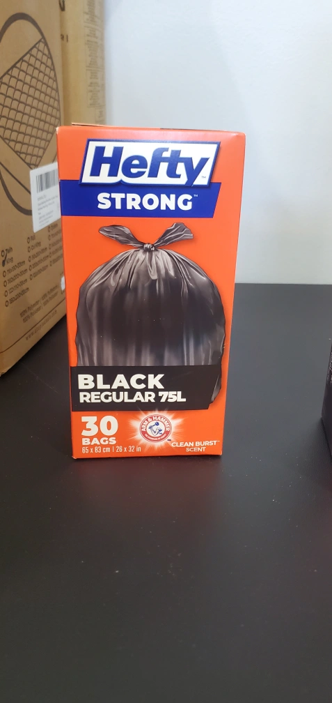 Selling a box of Hefty Strong black garbage bags. These are regular size, 75L bags, and the box contains 30 bags. They have a clean burst scent and measure 65 x 83 cm (26 x 32 in).