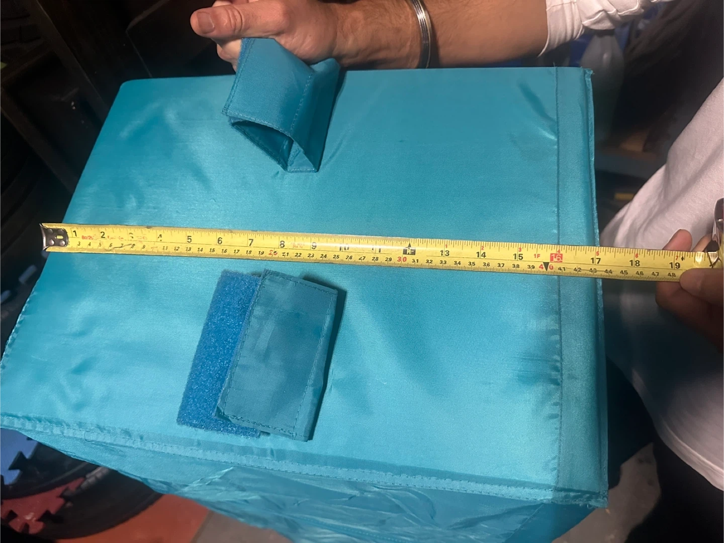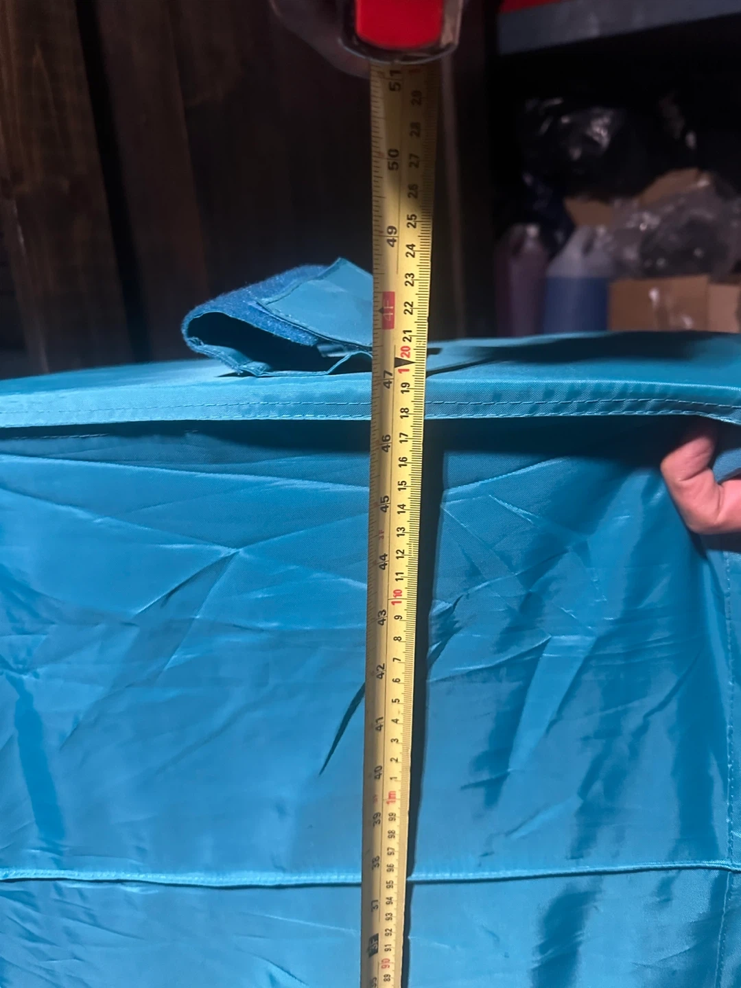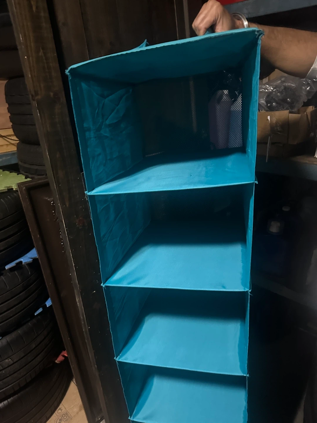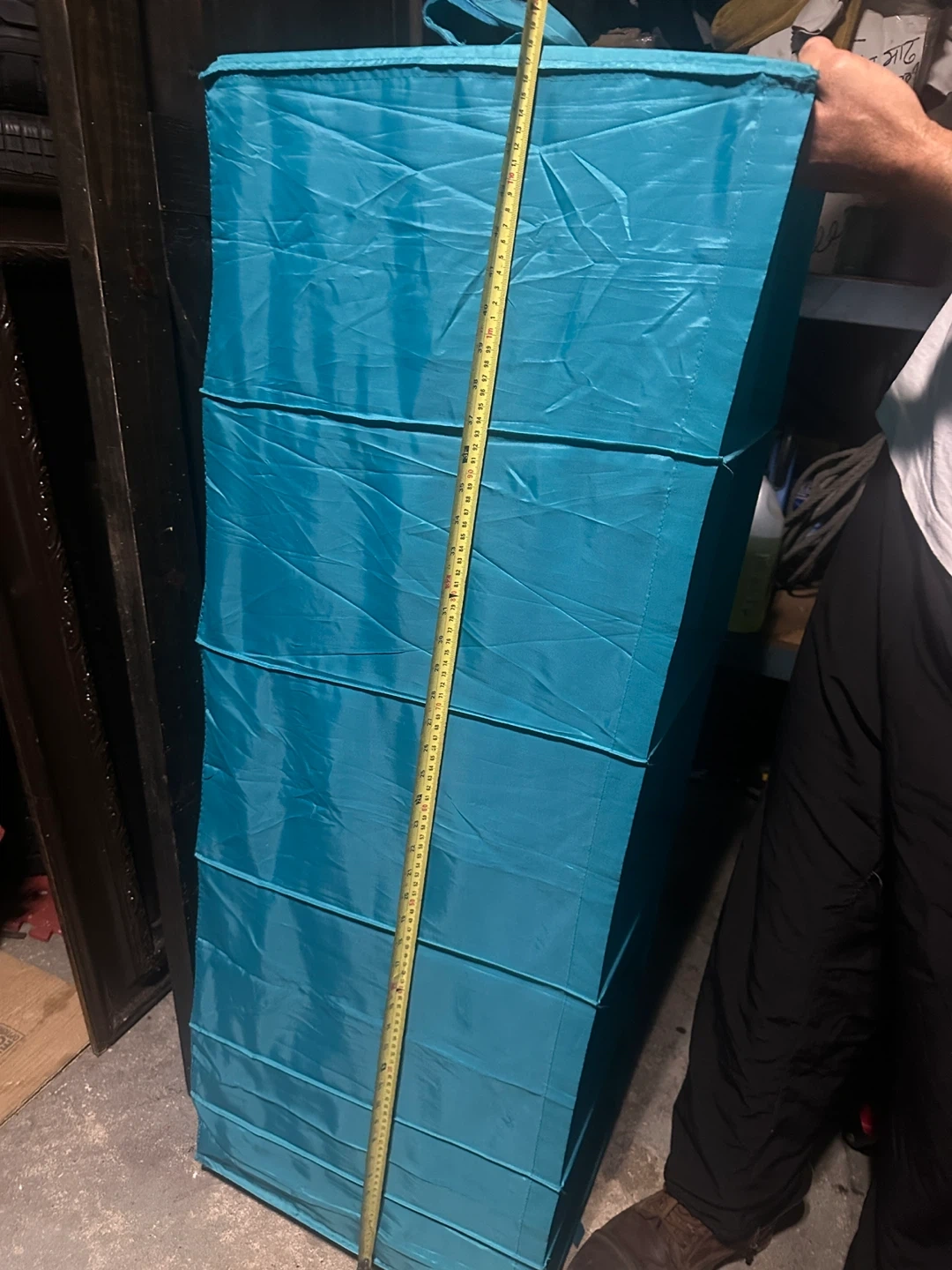 15I'm selling a turquoise hanging closet organizer! It's perfect for adding extra storage space to your closet. It measures about 50 inches tall and 17 inches wide, so it's a great size for most closets. It's in great condition and ready to use!