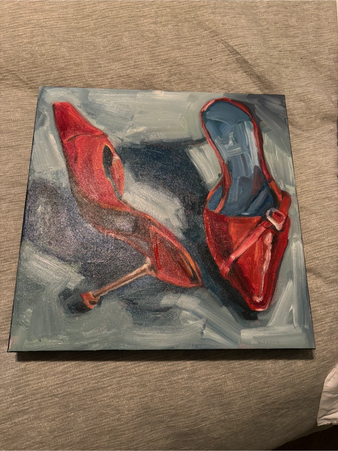 A beautiful painting of red heels, perfect for adding a pop of colour to any room! The brushstrokes and colours used really make the piece stand out