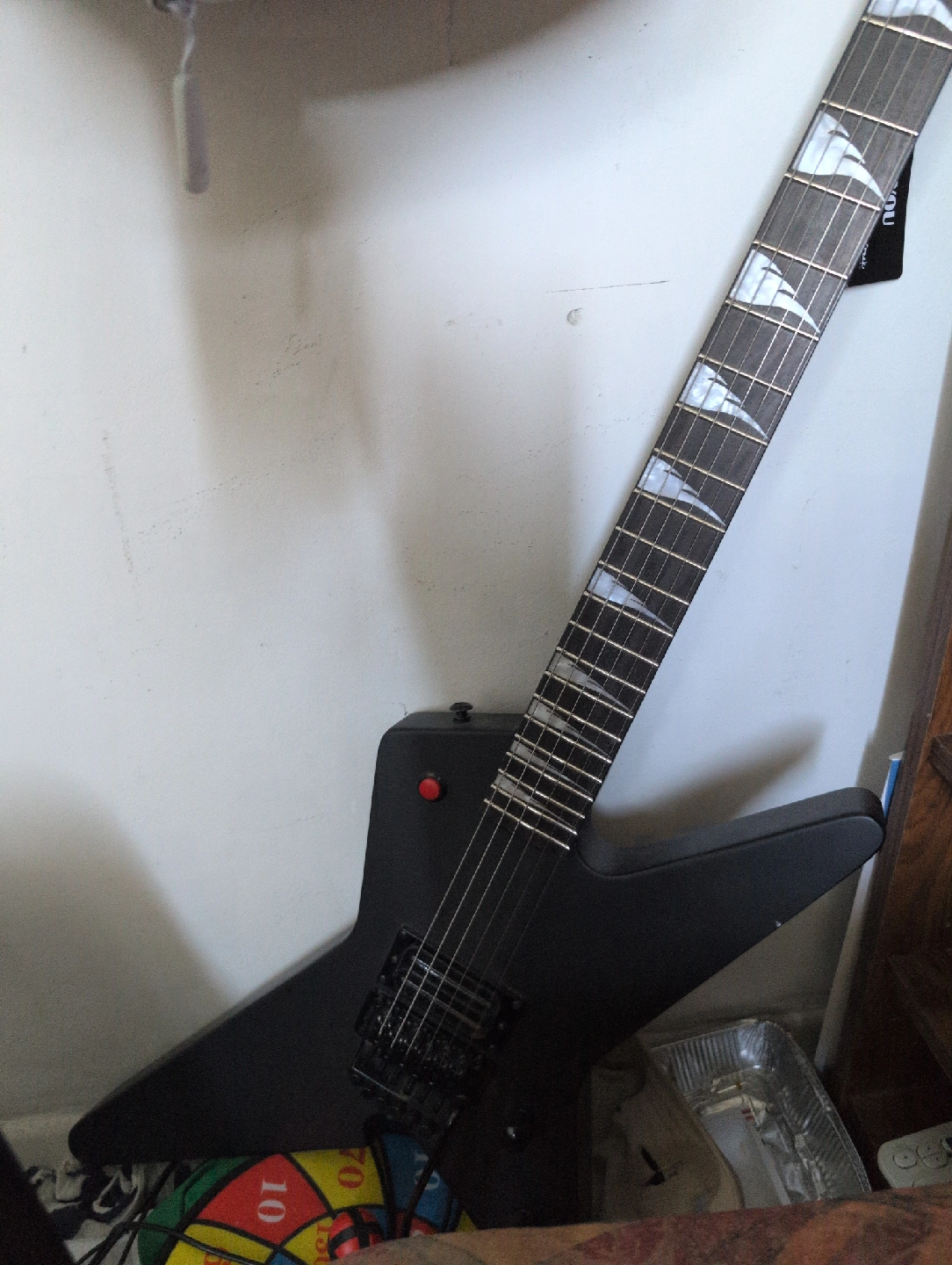 Selling a black, explorer style electric guitar. It's in good condition and ready to play! Perfect for someone looking to rock out or learn a new instrument