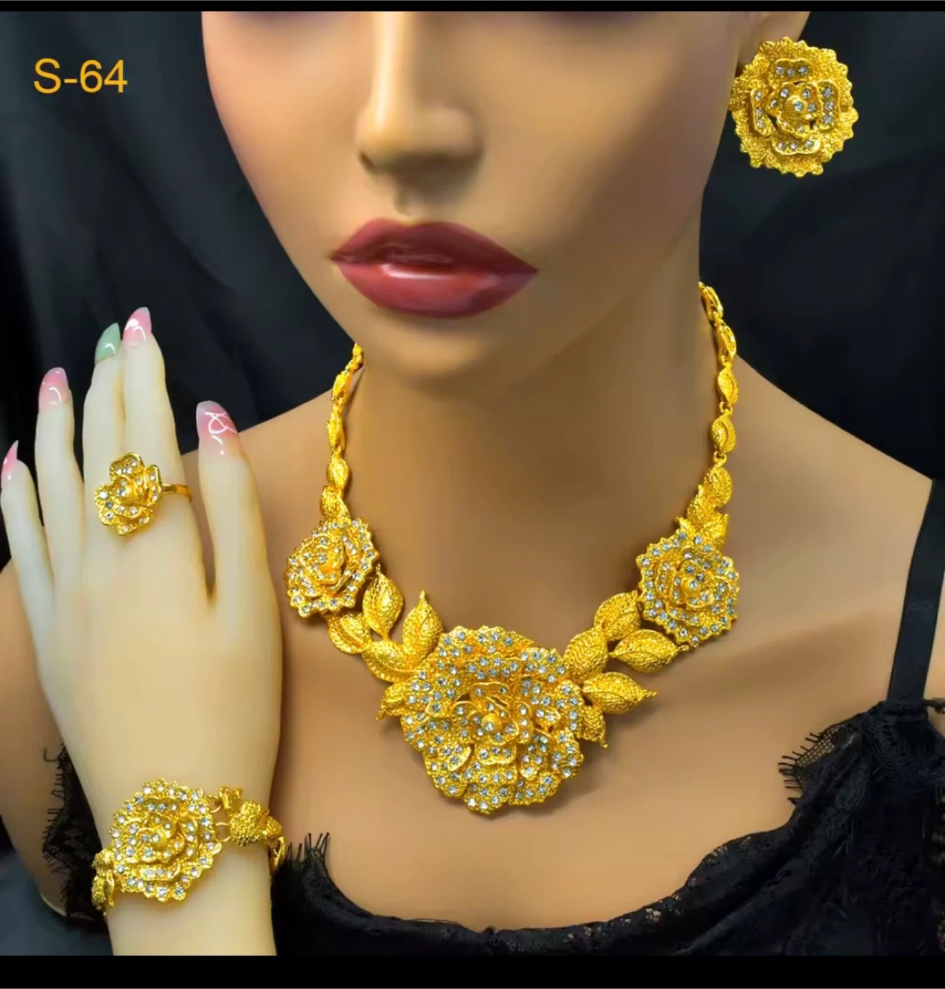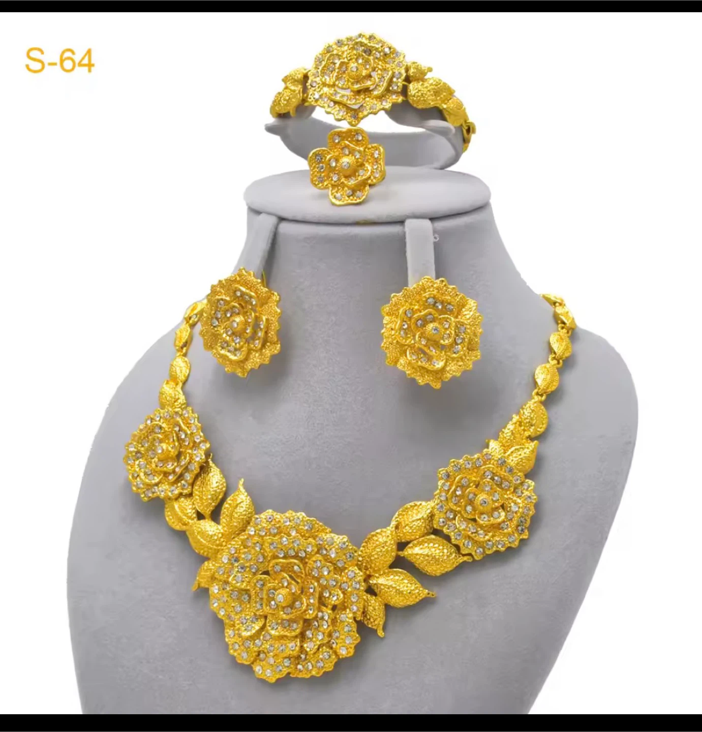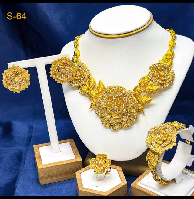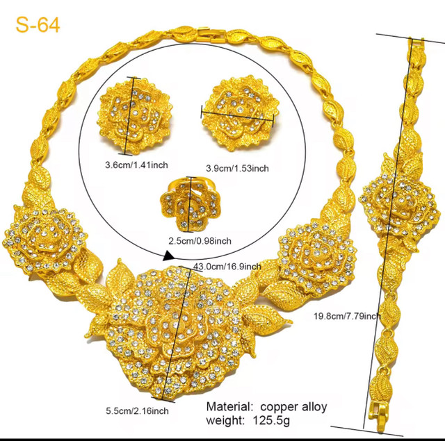 Dubai Jewellery set includes a necklace, earrings, ring, and bracelet, all plated in 24k gold and adorned with flower-shaped accents. This never used jewellery set is made from a zinc alloy and is designed in a cute and romantic style, perfect for weddings or special occasions. Key Features: * Plating: 24k Gold Plated * Material: Metal * Metals Type: Zinc Alloy * Style: Cute/Romantic * Shape/Pattern: Flower Looking for a touch of elegance? If the ad is up, it's available, ready to add some sparkle to your life!