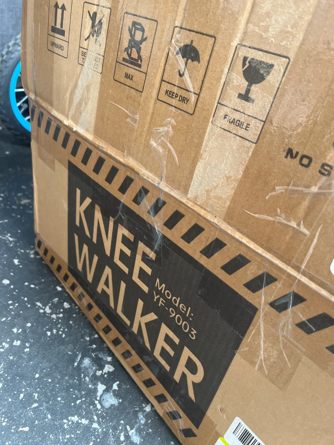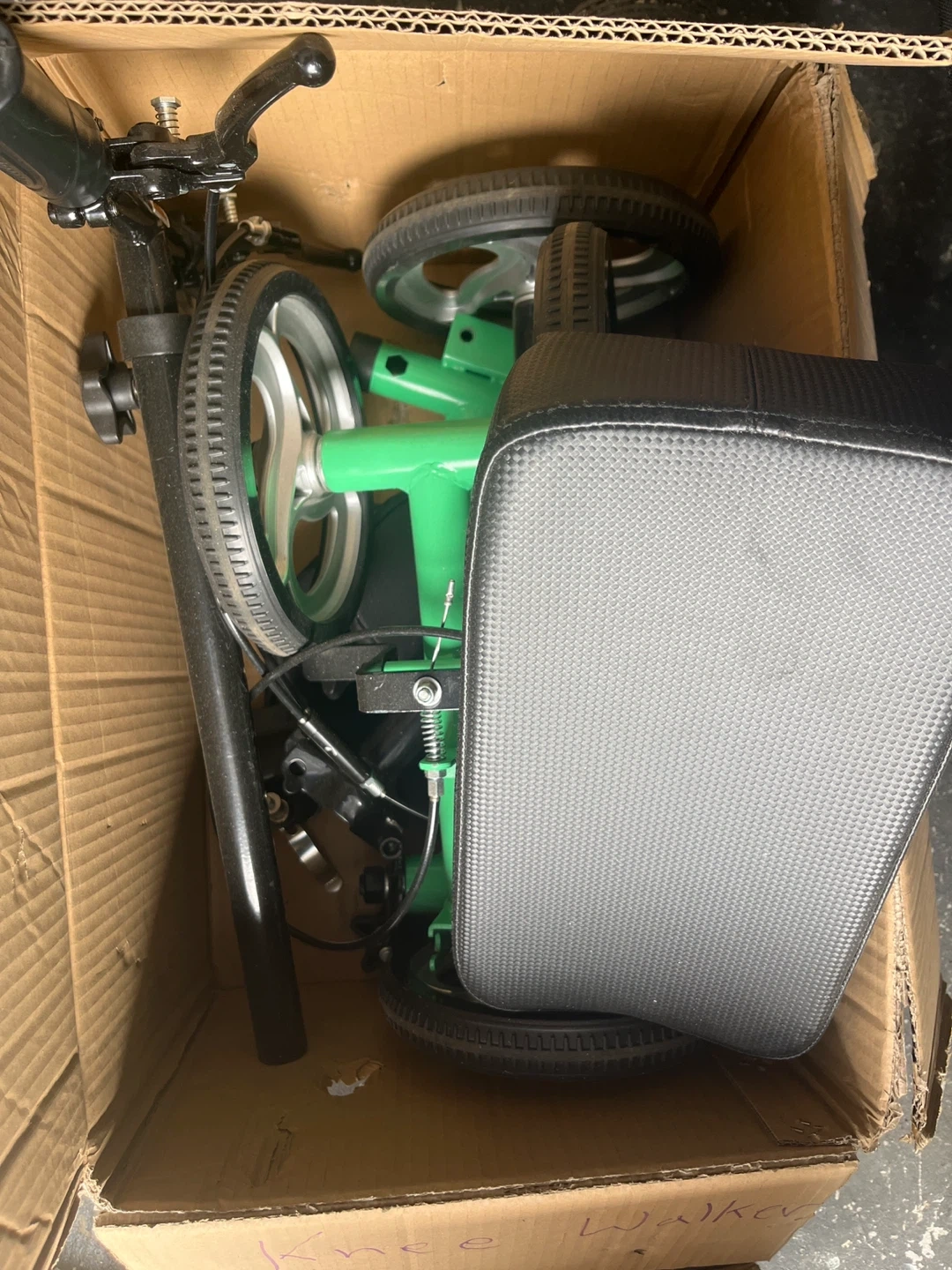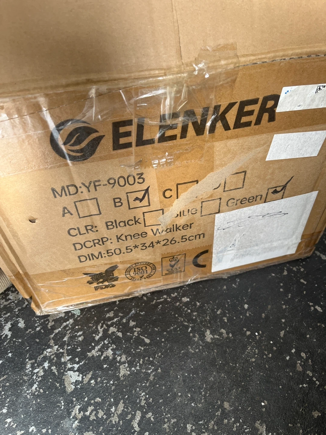 Selling a green Elenker Knee Walker, model YF-9003. It's in great condition and comes in the original box. Dimensions are 50.5 x 34 x 26.5 cm