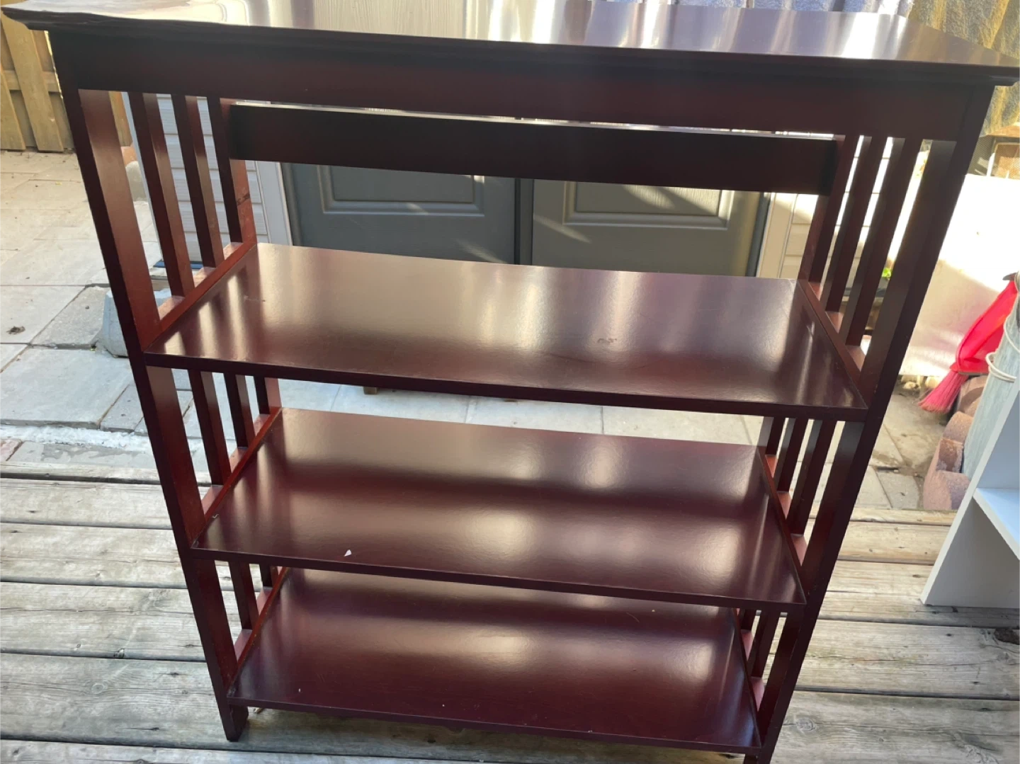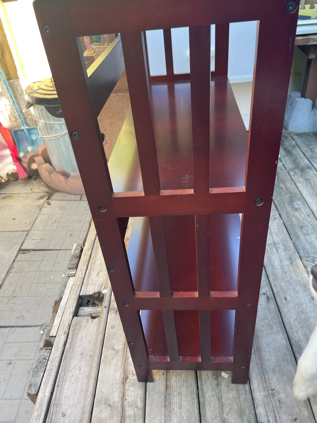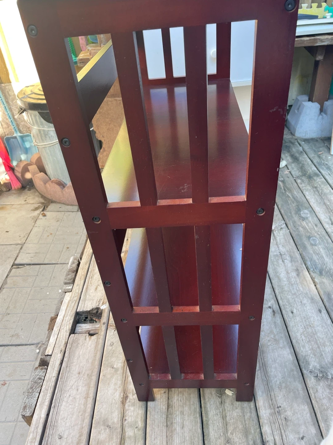 Selling a Brown-coloured wooden Shelf. It has three shelves and a sturdy frame. Top just needs a repaint. No wobbling and nothing hindering its usage.