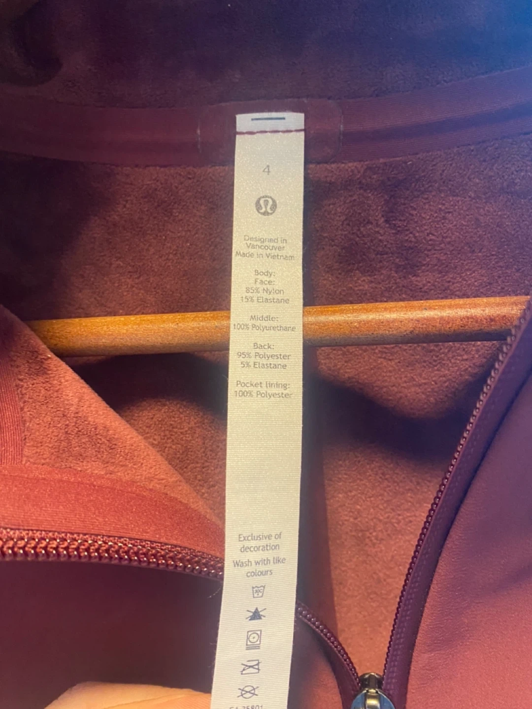 Selling a Lululemon jacket in a beautiful maroon colour, size 4! The tag shows the body is made of 71% nylon and 15% elastane, the middle is 100% polyurethane, the back is 95% polyester and 5% elastane, and the pocket lining is 100% polyester. It's in great condition and ready for a new home!