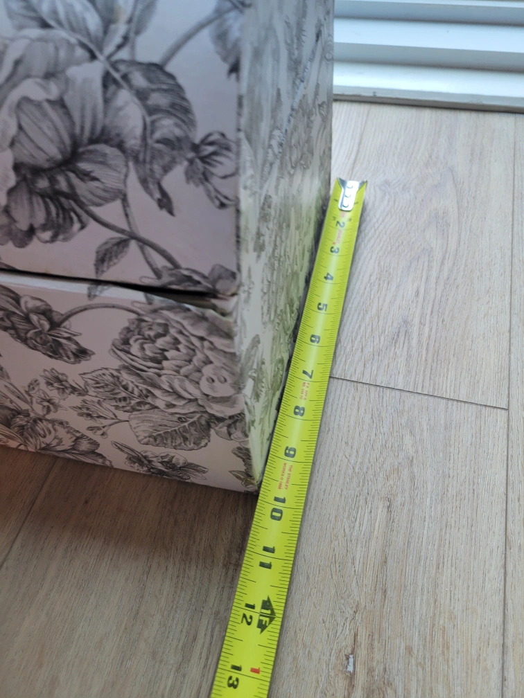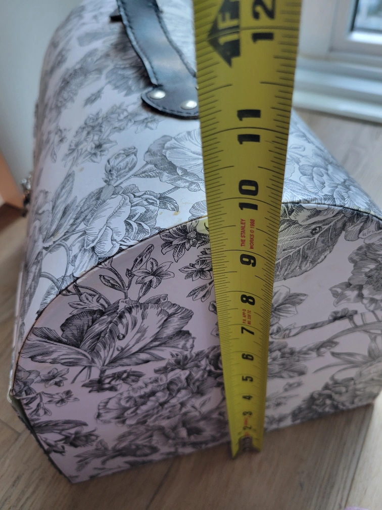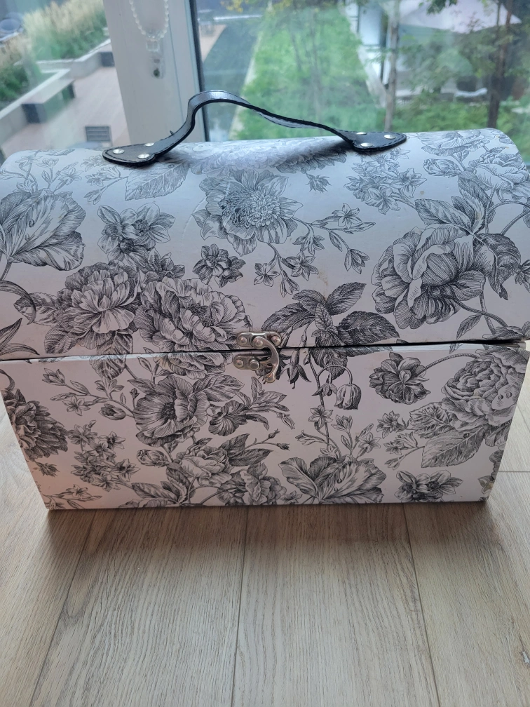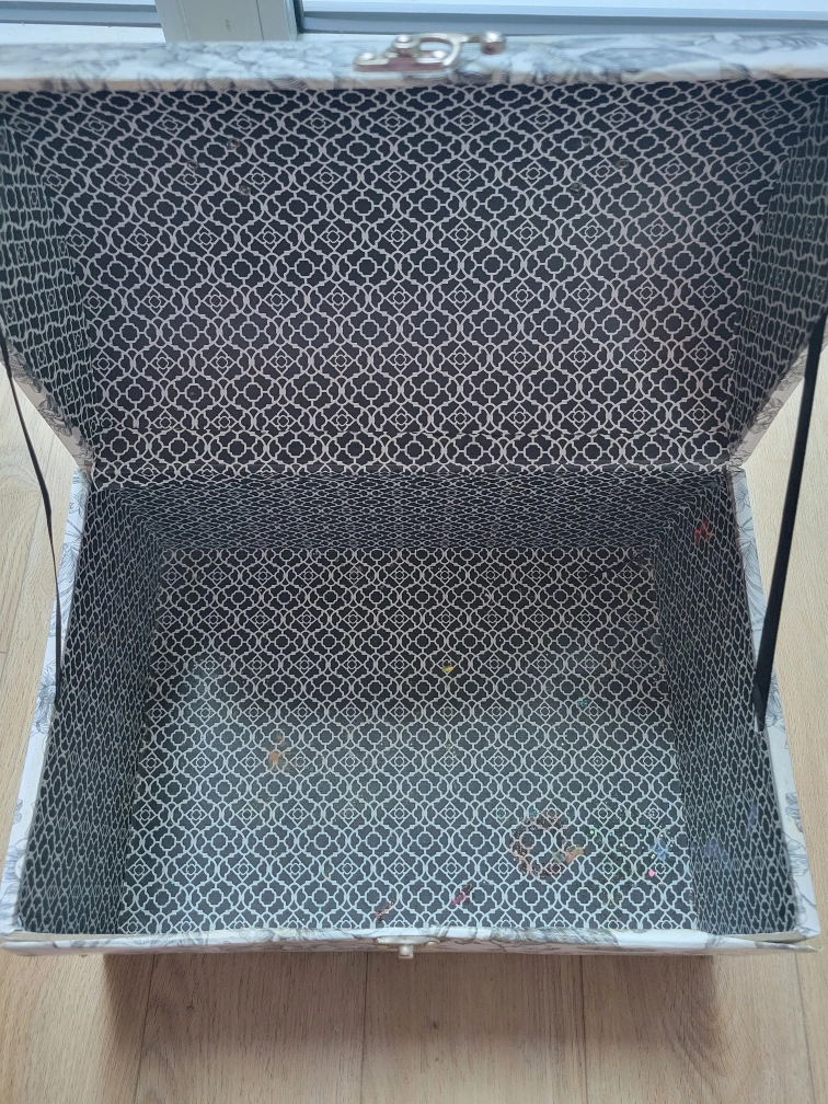 Rehoming a cute storage trunk with a floral pattern! It's in great shape and perfect for storing various items. The dimensions are approximately 14 inches in length and 12 inches in height. The interior has a patterned lining too