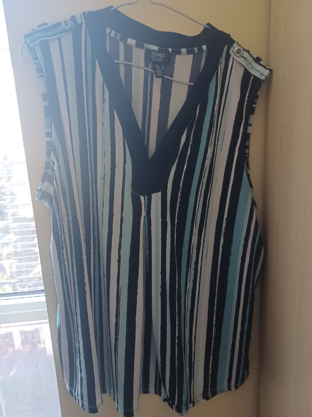 Jones New York sleeveless top in size L The top features a striped pattern in blue, white, and black. It is in great condition and ready for a new home!