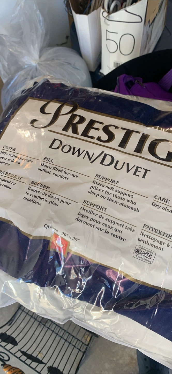 This is a Prestige down/duvet in queen size! It's down-filled for the softest comfort and has extra soft support for those who sleep on their stomach. The cover is 100% cotton percale. The pillow size is 20" x 29"