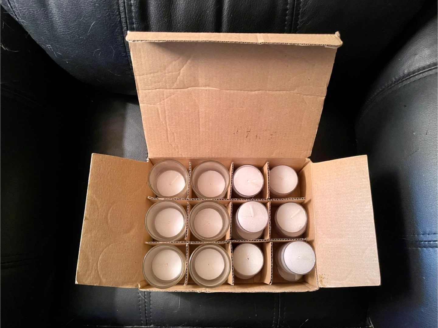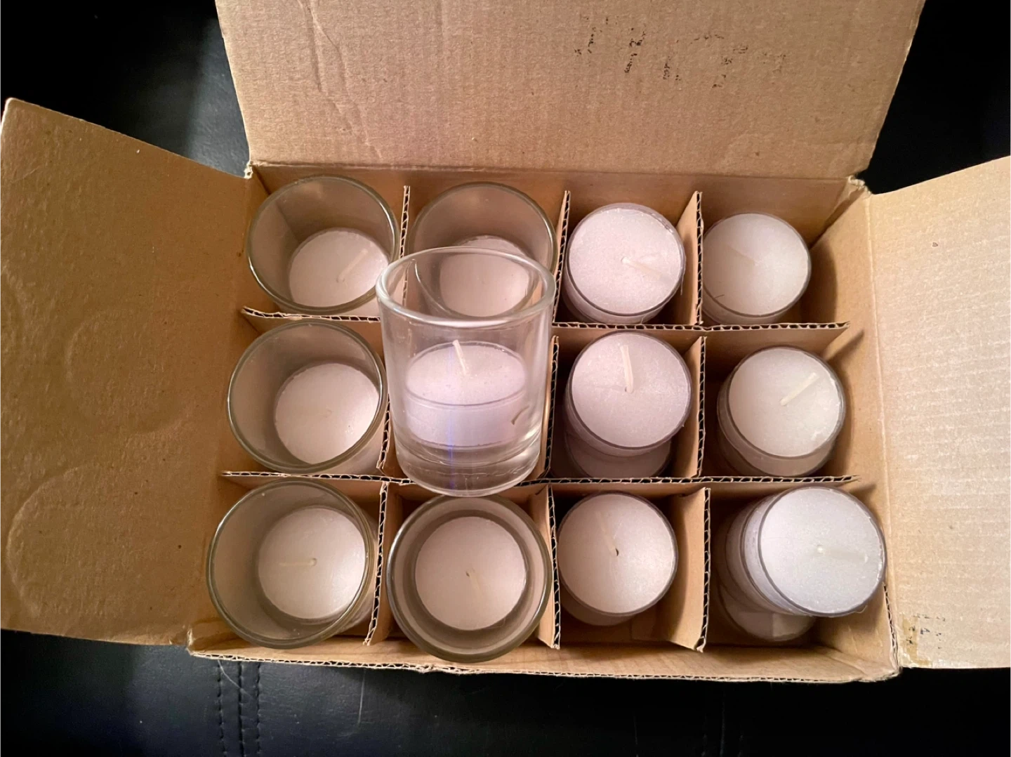 Selling a box of Yummi tea lights. Six clear glass candle holders each with a candle in it +21 extra candles. The box is included, making it easy to store and transport them. Perfect for creating a cozy atmosphere in your home!