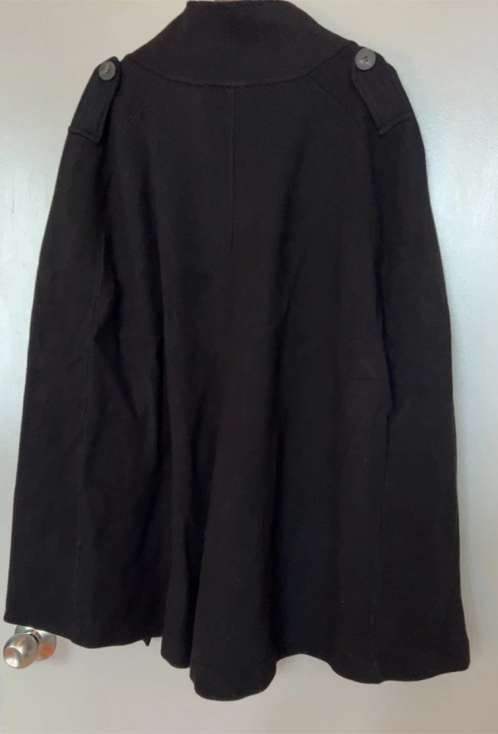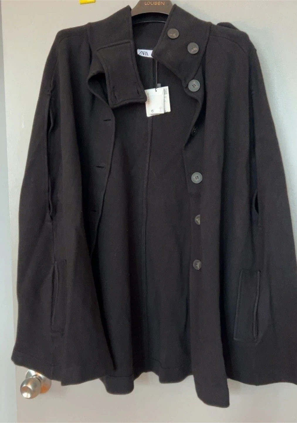 Here's a stylish black cape from Zara! It's in great condition and ready to keep you warm and fashionable. The coat features a unique button design and a comfortable fit. Perfect for layering during the cooler months!
