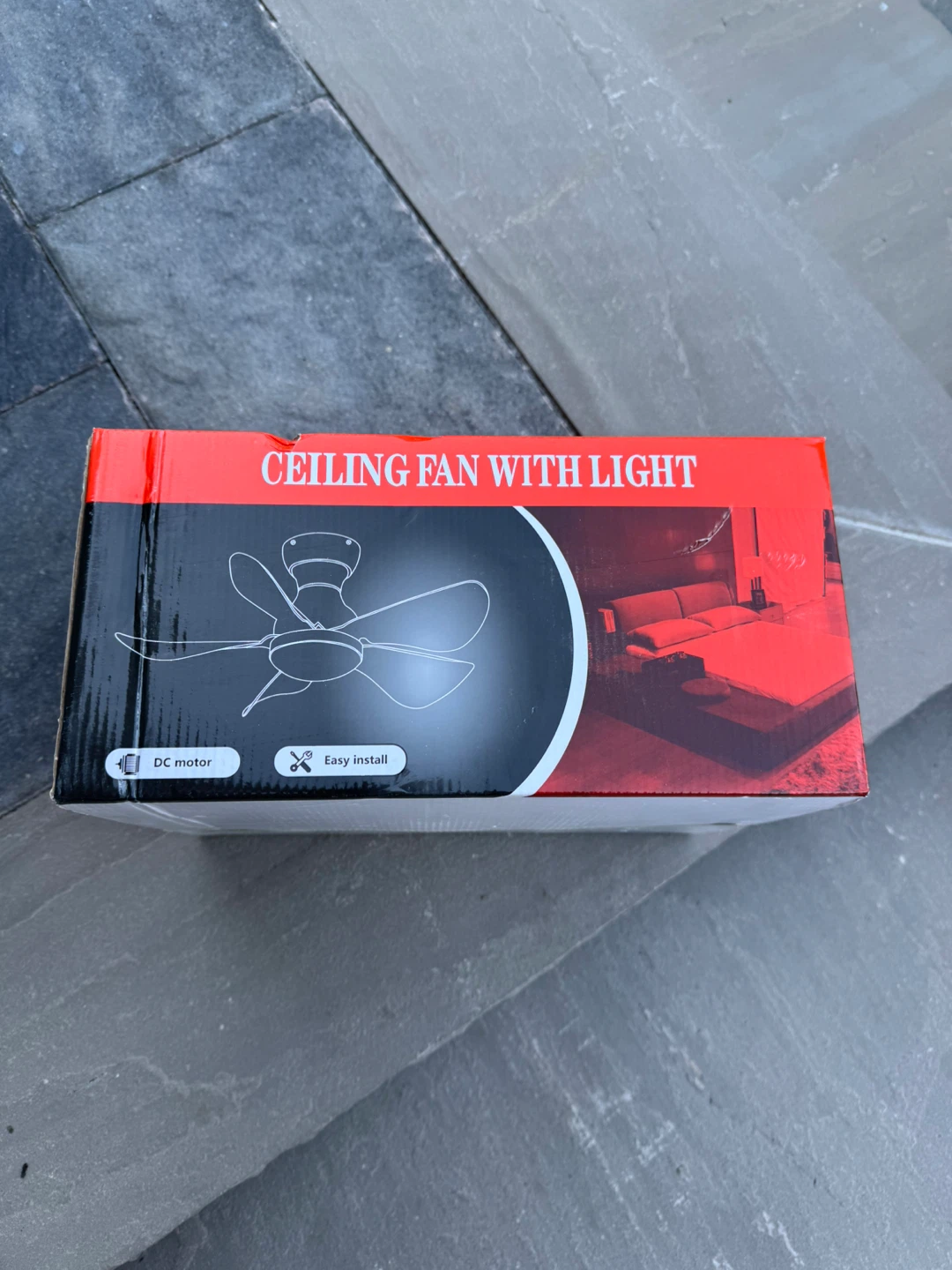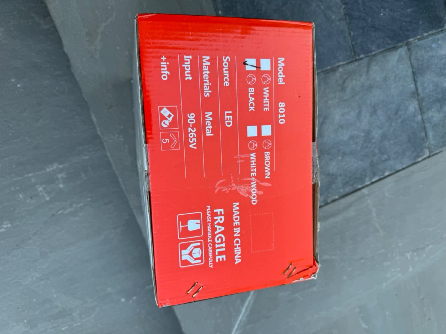 Ceiling fan with light, model 8010. It's easy to install and has a DC motor. The materials are metal and wood. The input is 90-265V.