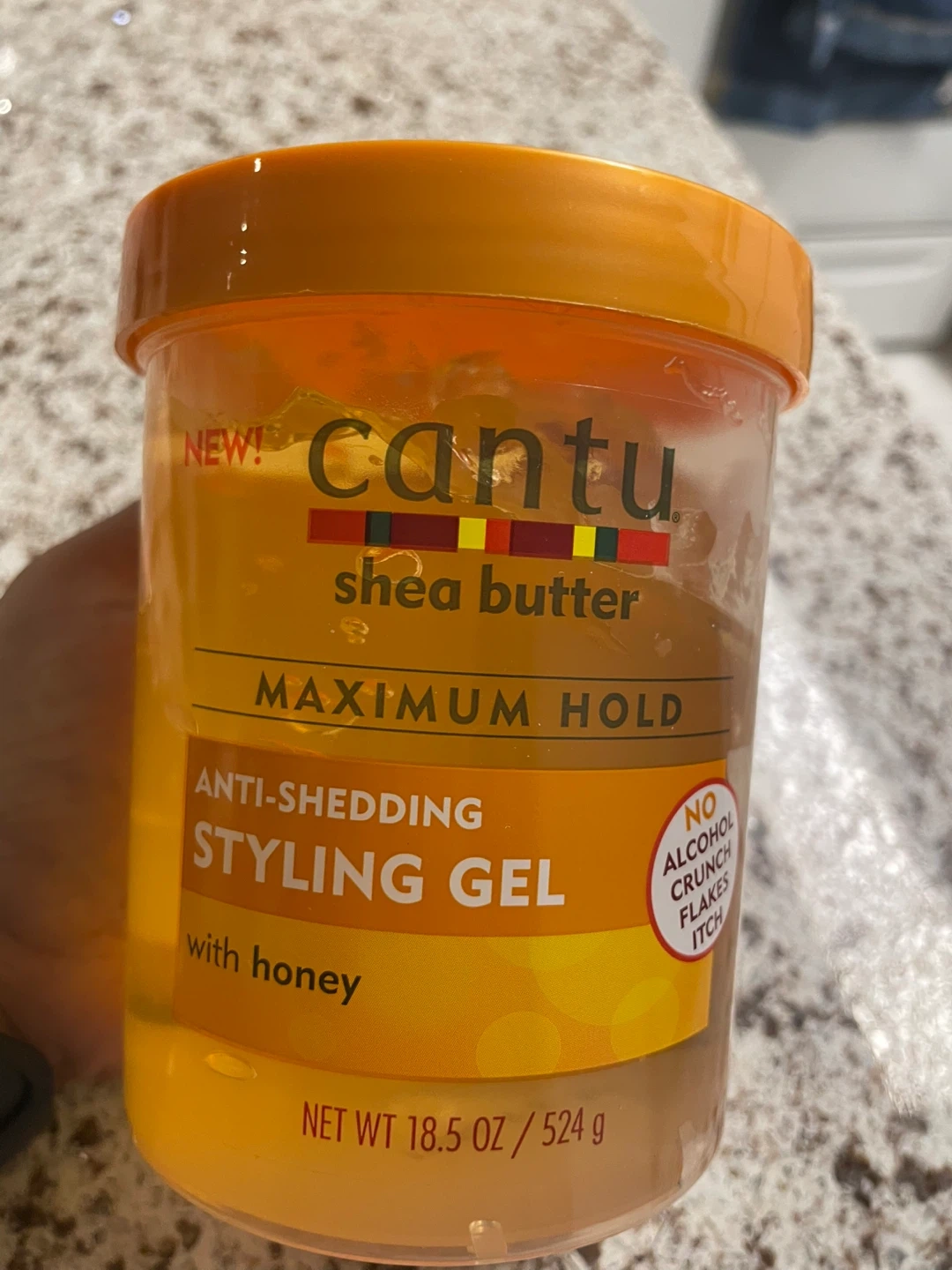 Selling a new jar of Cantu Shea Butter Maximum Hold Styling Gel. This anti-shedding styling gel is formulated with honey and provides maximum hold. It's a great product for achieving your desired hairstyle while keeping your hair healthy and flake-free since it contains no alcohol. Net weight is 18.5 oz / 524 g