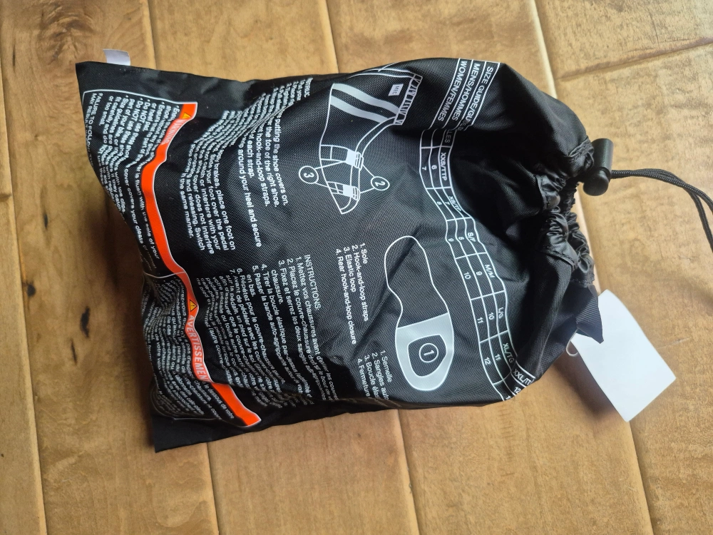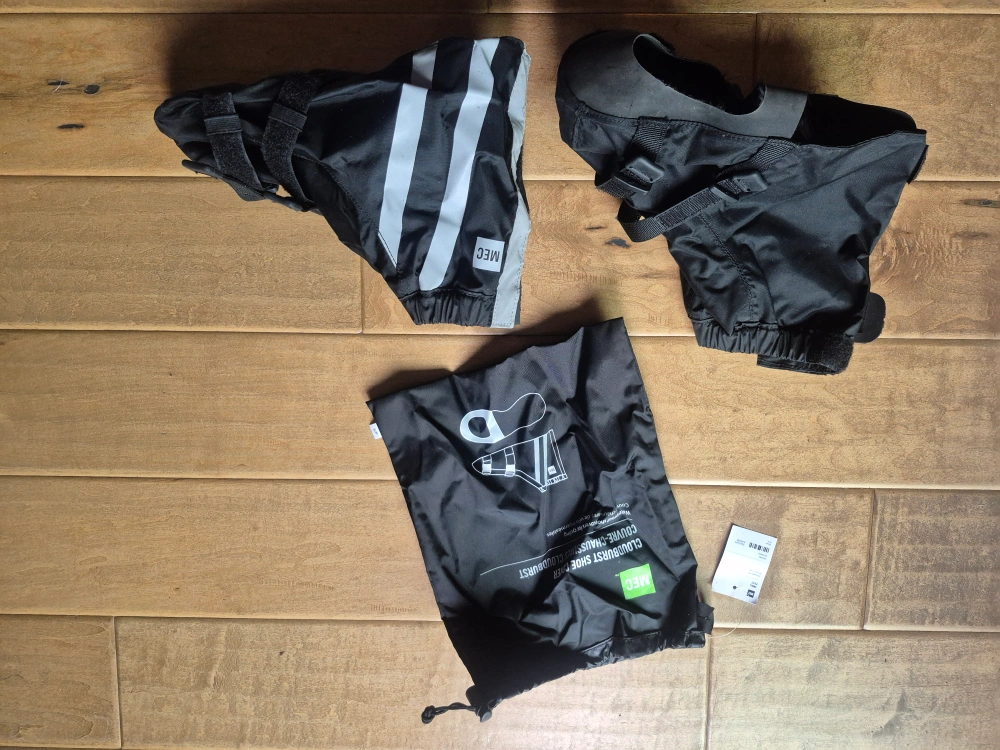 Selling a pair of MEC Cloudburst shoe covers in size small. These are great for keeping your feet dry on wet rides. They come with their original carrying bag, and the size chart is printed right on it! They are black with reflective stripes.