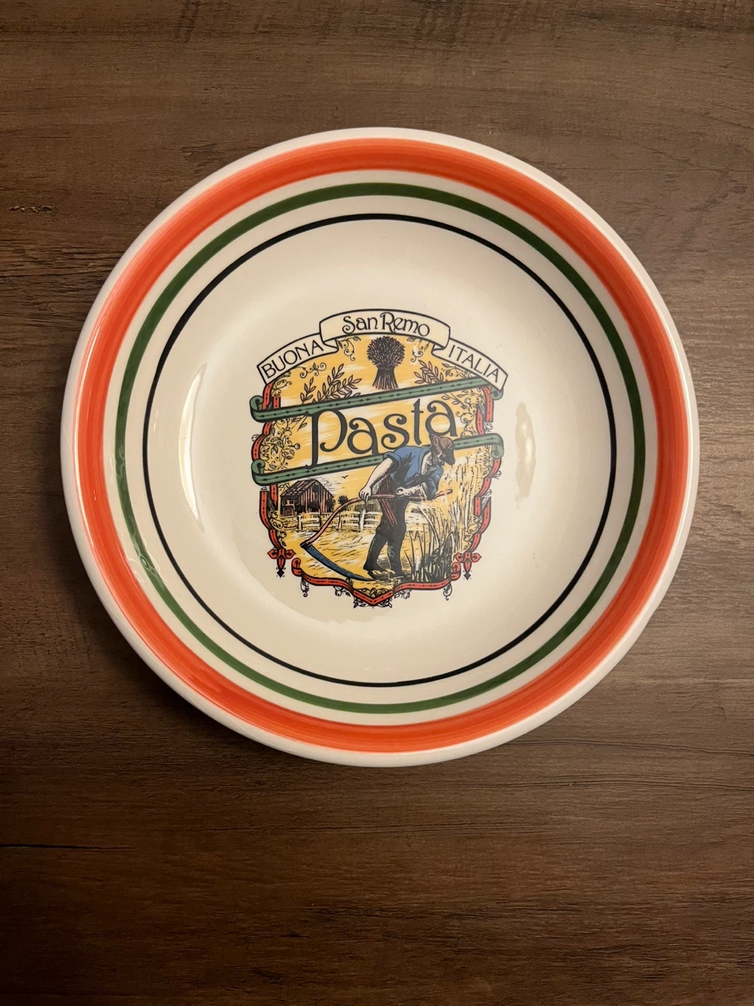 Selling a charming San Remo pasta plate! It features a colourful design with a depiction of a farmer harvesting wheat. The plate is marked "Made in Italy for Nimark". It would be a lovely addition to any kitchen or collection!