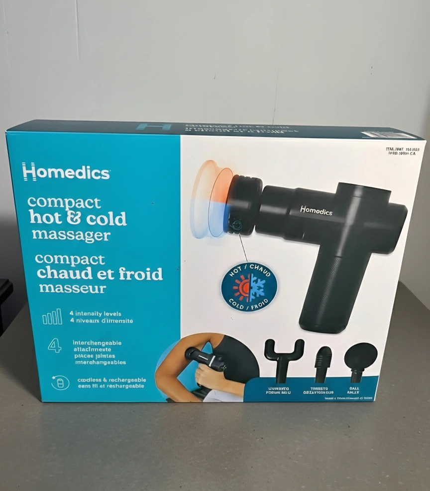 I'm selling a HoMedics compact hot and cold massager! It helps relax tight muscles, improve circulation, and reduce discomfort from tension or fatigue. It also has a cold therapy option, ideal for reducing inflammation and soothing muscle soreness. The box includes 4 interchangeable massage heads