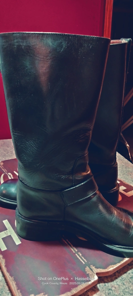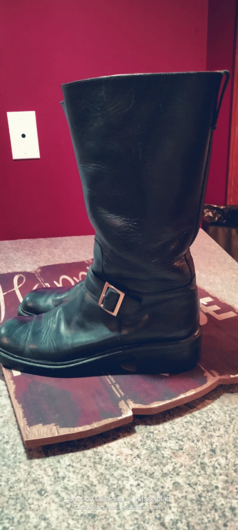 Gucci black leather boots. They are pre-owned and show some signs of wear, but they are still in good condition. These boots feature a classic design with a buckle detail.Size 8.5 B