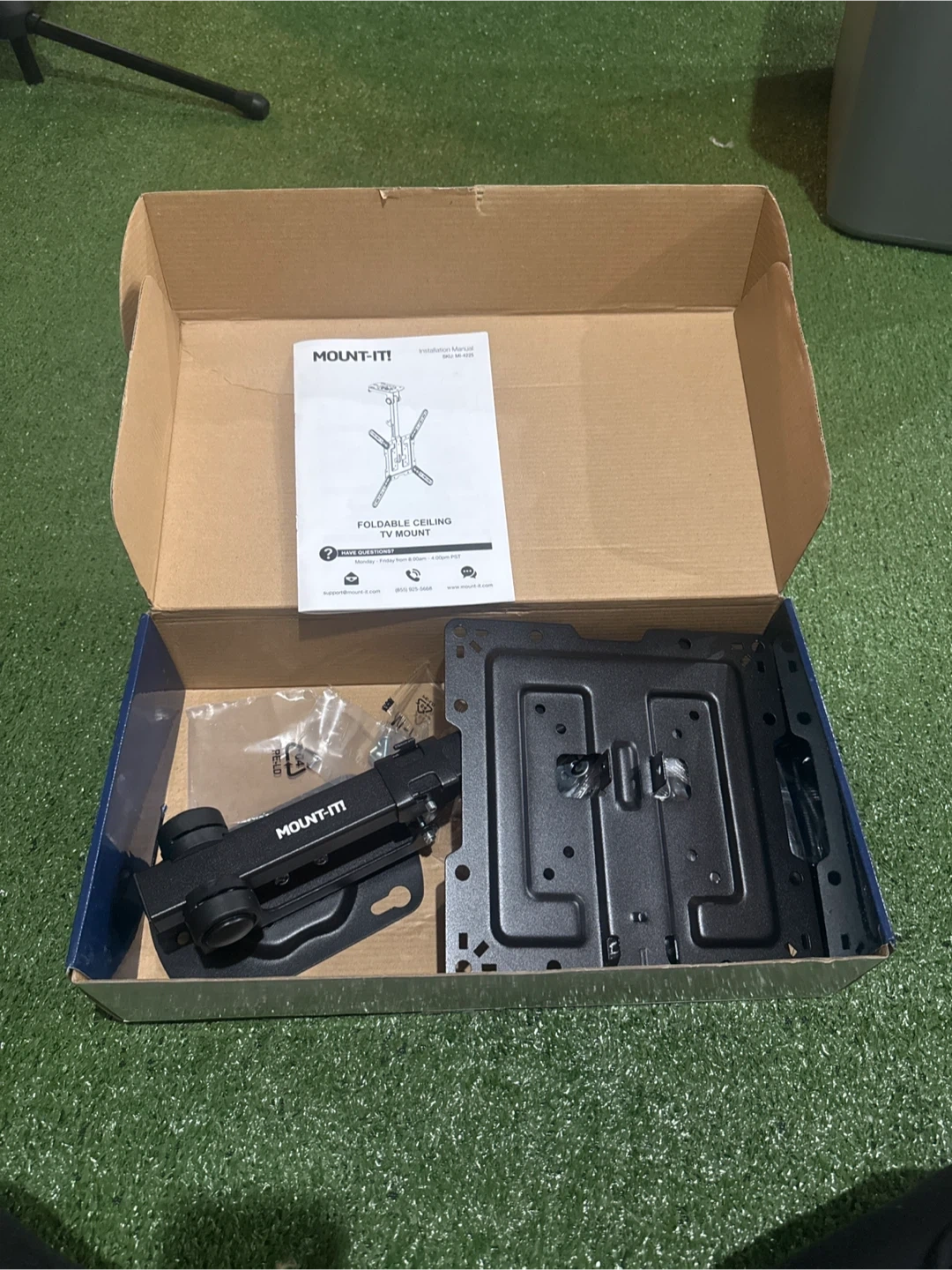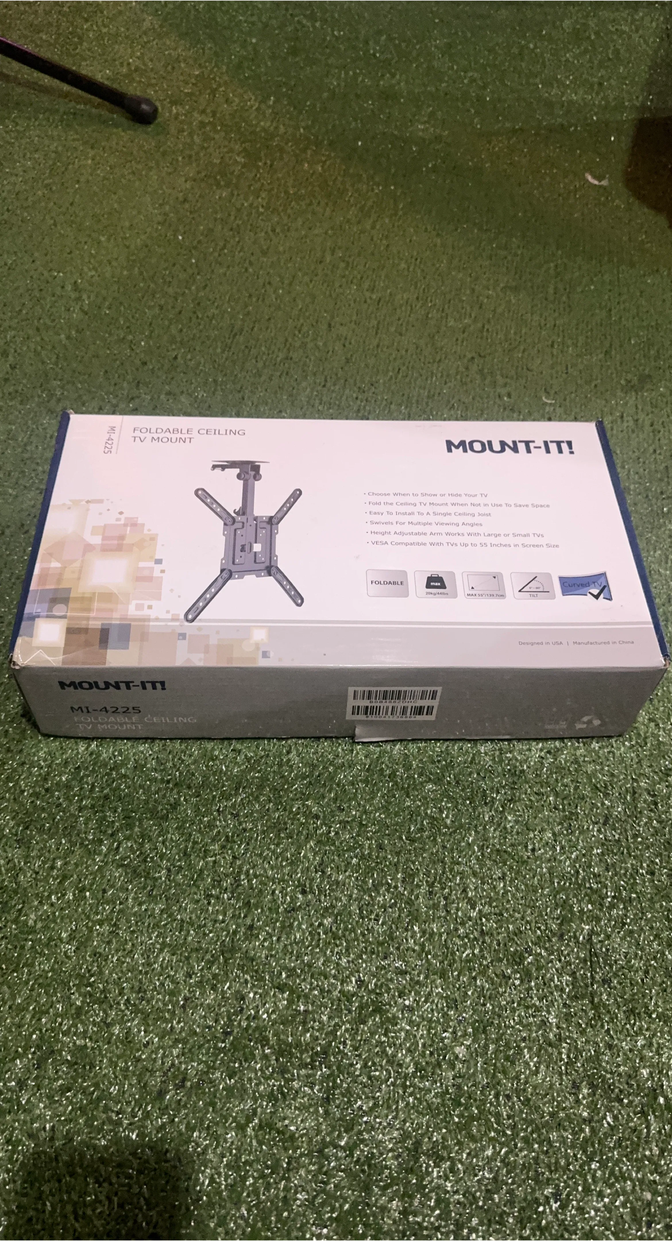 Selling a Mount-It! Foldable Ceiling TV Mount, model MI-4225. It's designed to help you maximize space by folding the TV mount when not in use. Suitable for multiple viewing angles and compatible with TVs up to 55 inches in screen size. Comes with all the necessary components and the original box