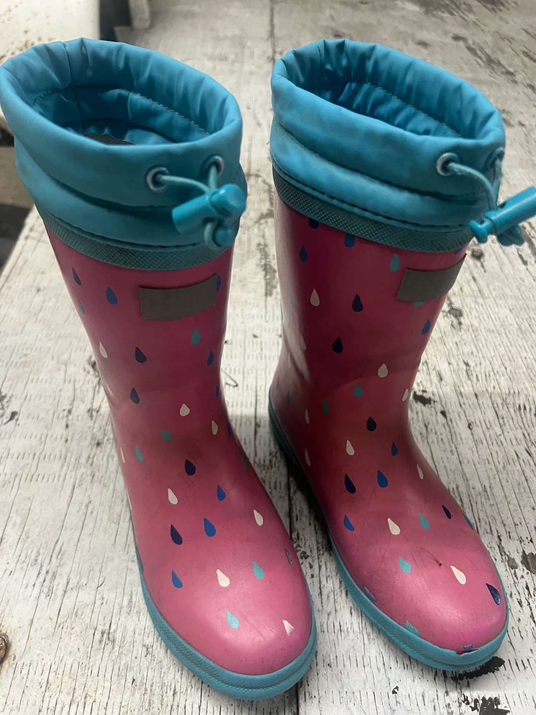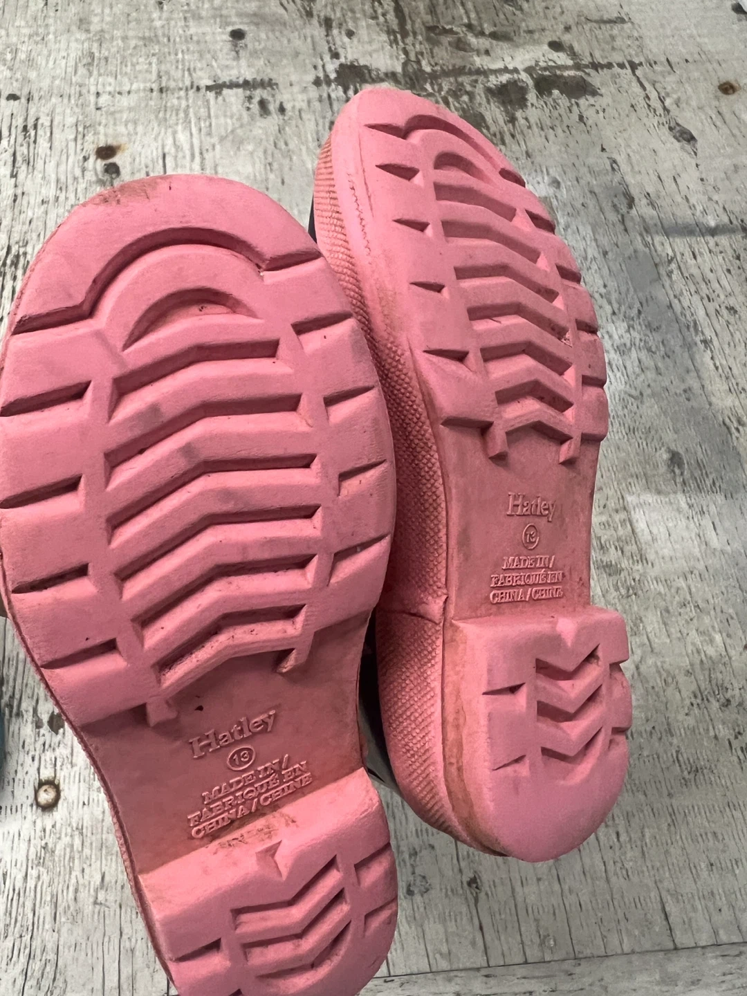 Cute Hatley brand rain boots for kids! One pair features a navy blue background with colourful stars size 3 and the other is pink with raindrop patterns size 13 , Both are in great condition and ready for some puddle jumping. , $15 each