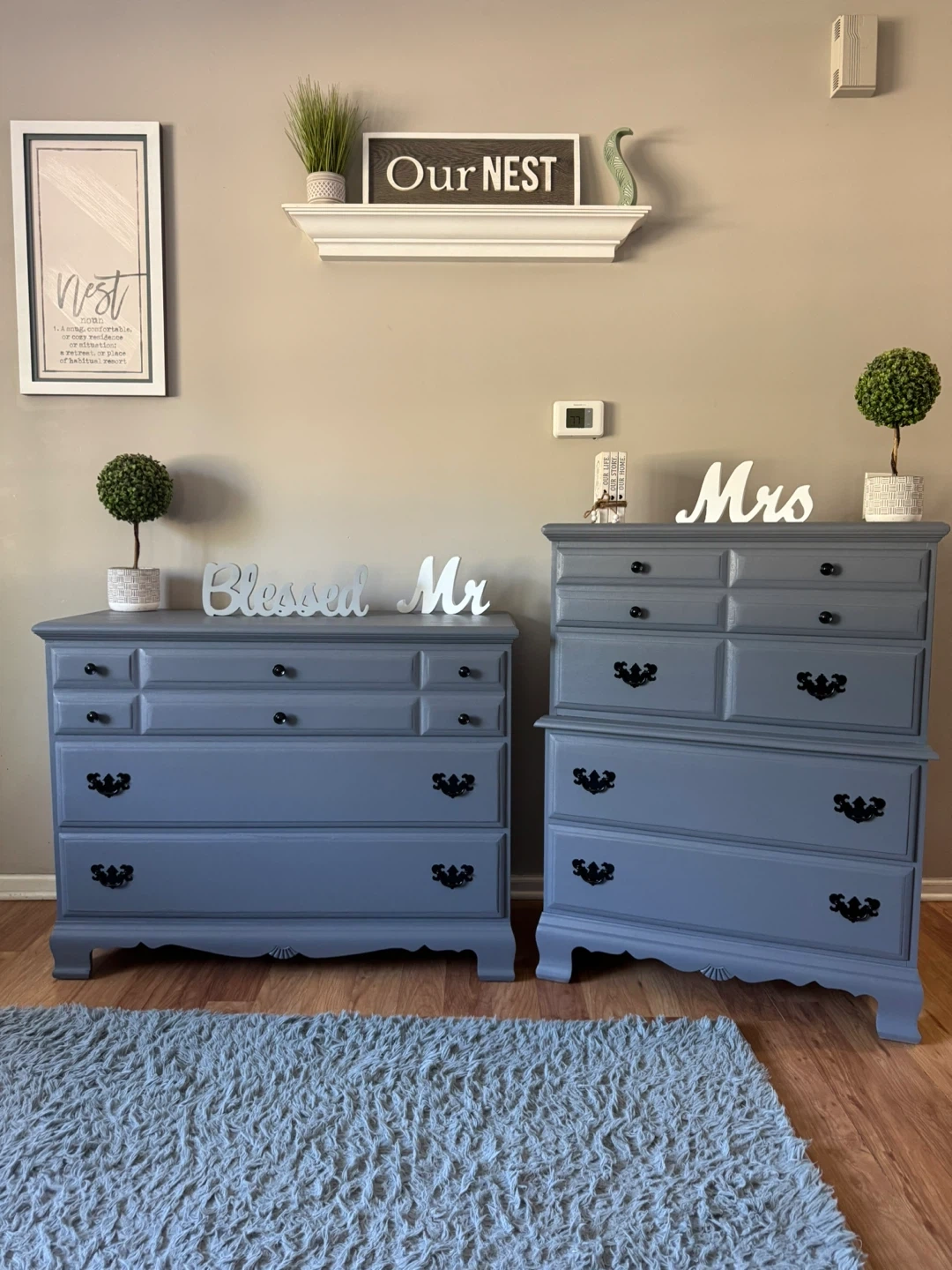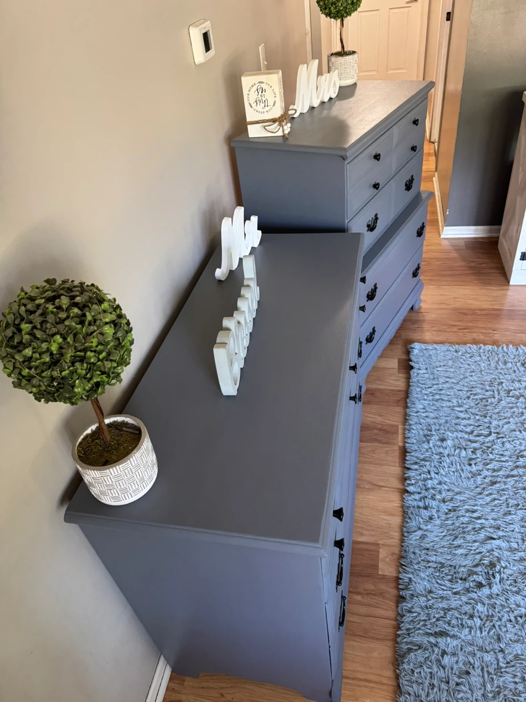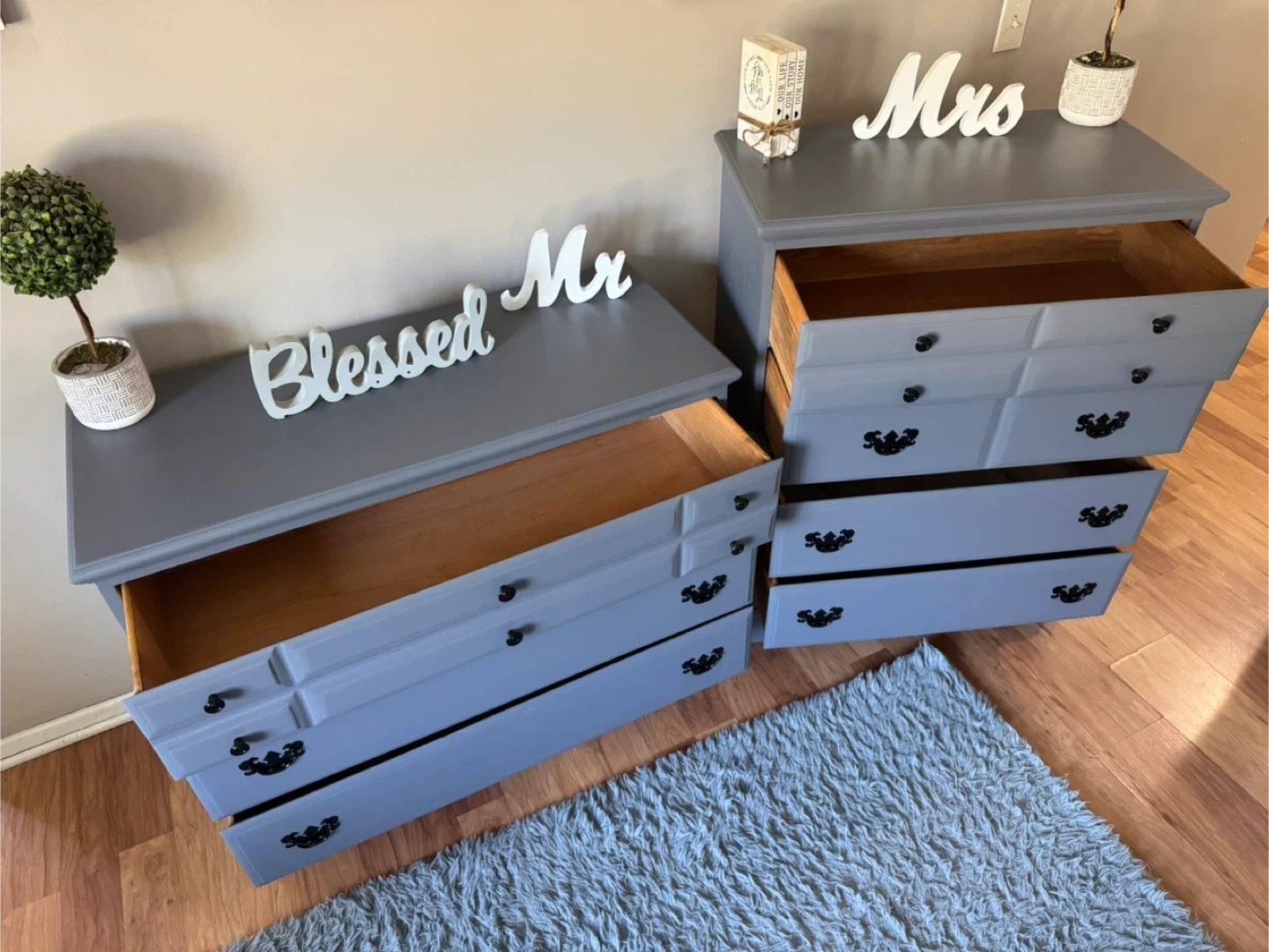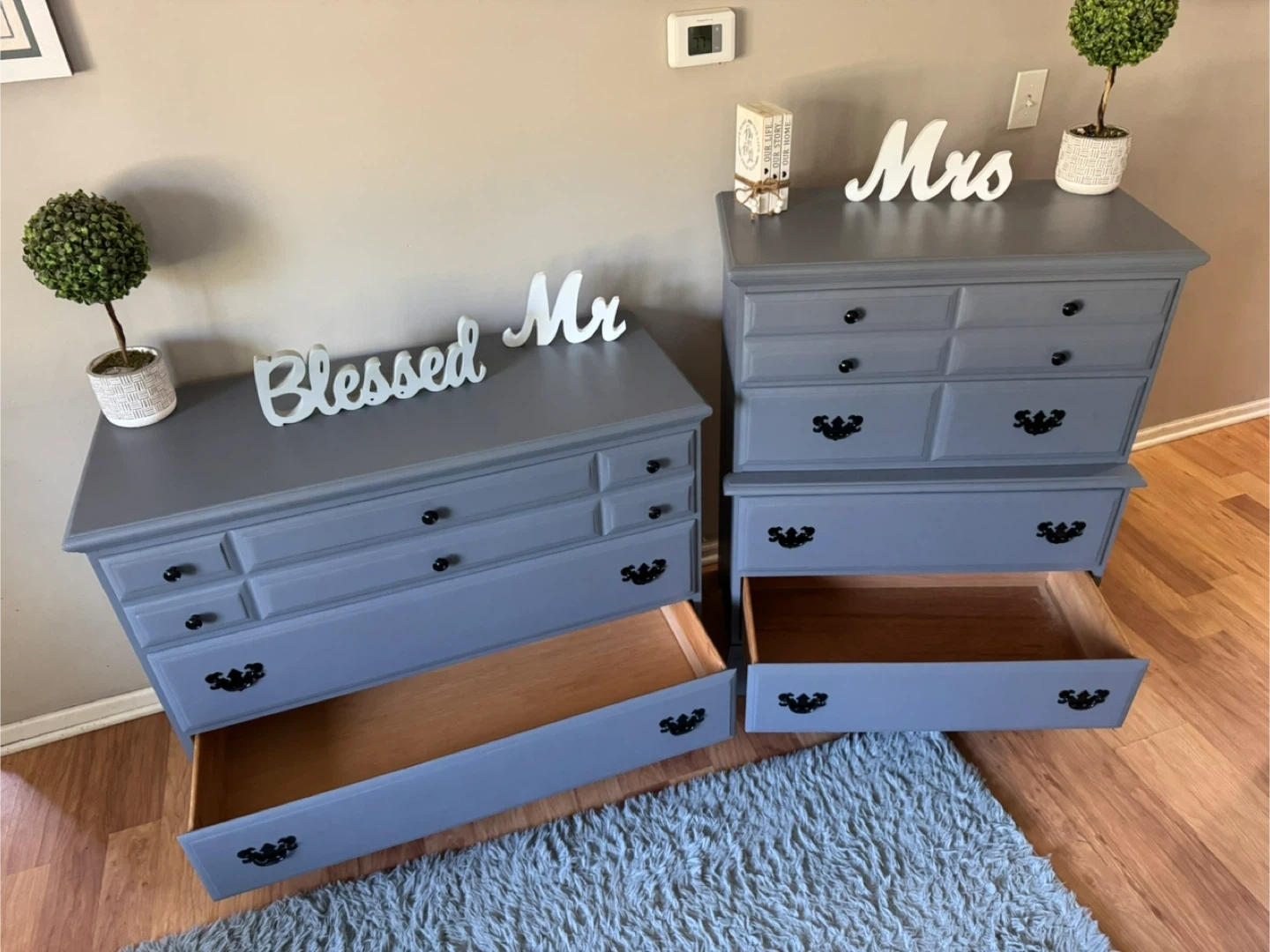 ✨Beautiful gray (can look bluish in bright light) solid refinished dresser set, solid furniture💪🏼,dovetail drawers in front & back🕊️ black hardware, all 7 drawers pull out fine on tracks, solid pieces💪🏼, Clean & sturdy! This is NOT that cheap wayfair/Ikea furniture, this will last you FOREVERR, I sell good quality furniture & my prices are still better/cheaper than a furniture store. Please don’t ask to lower my price‼️