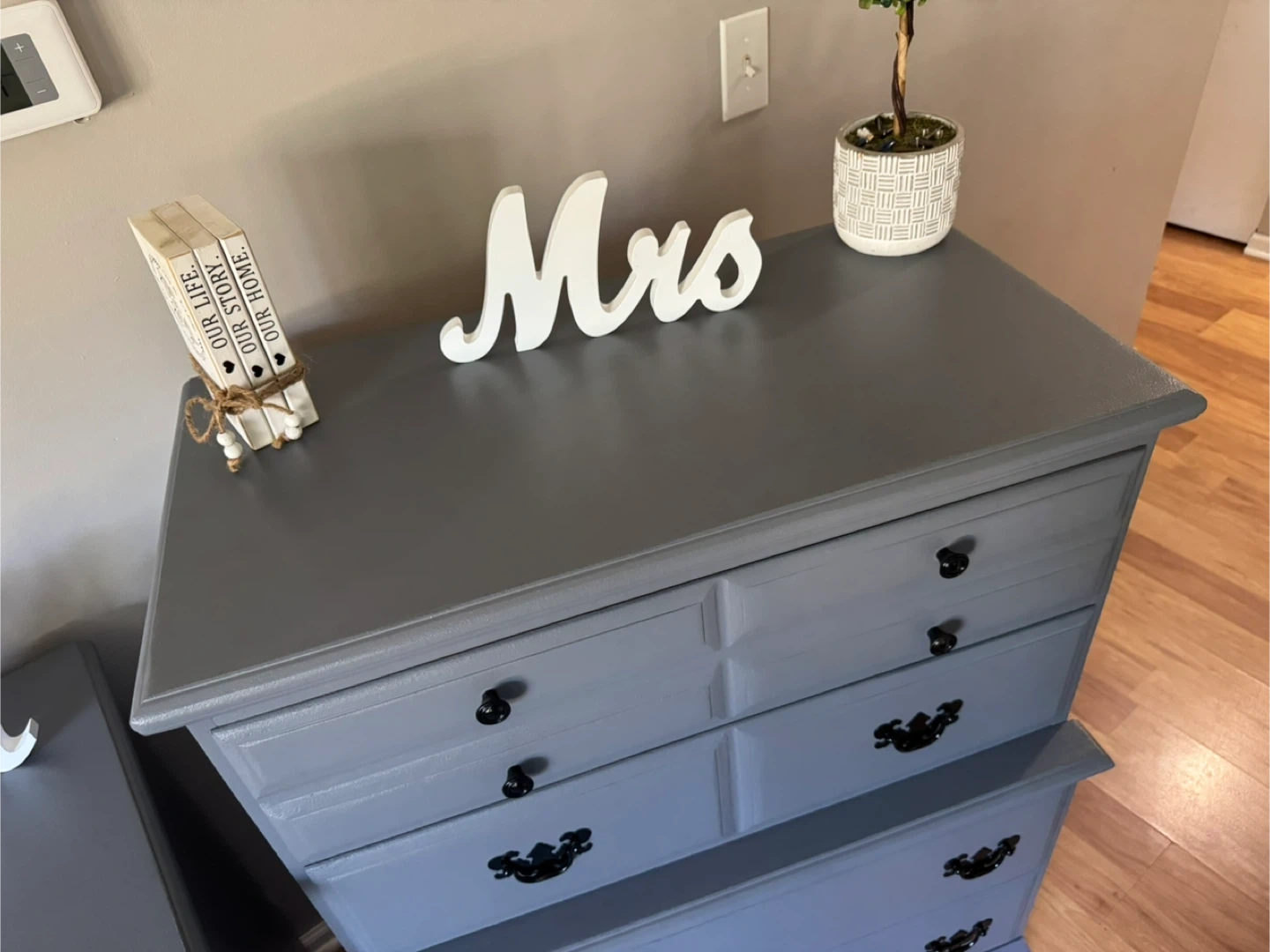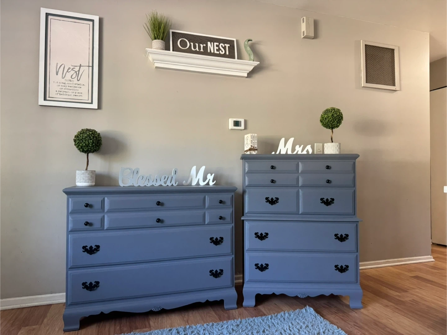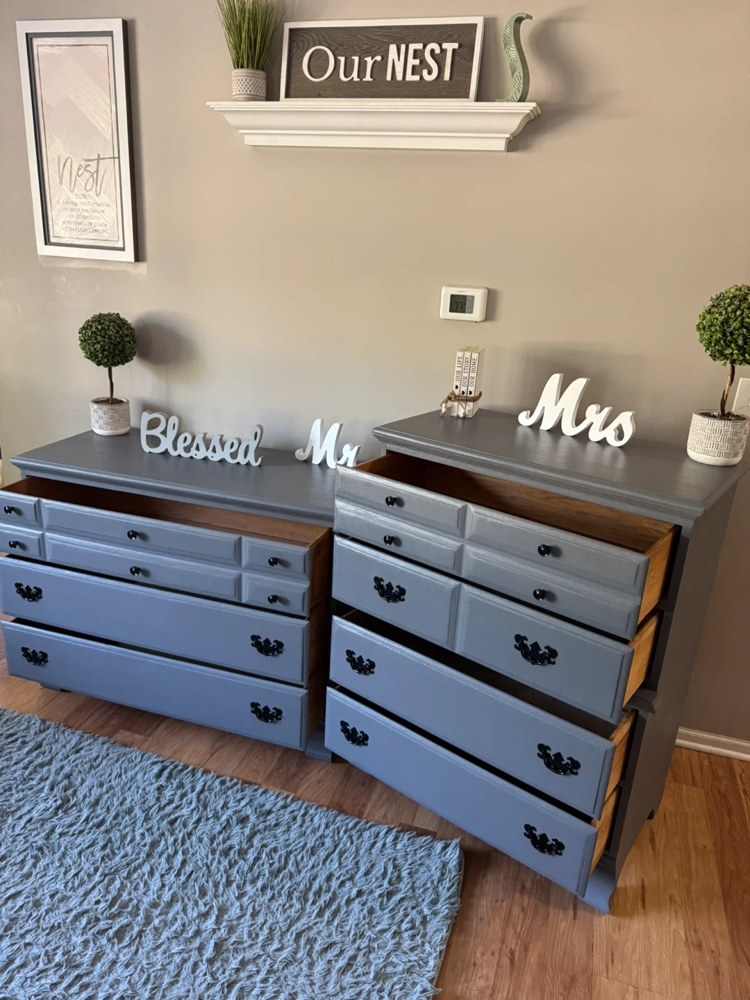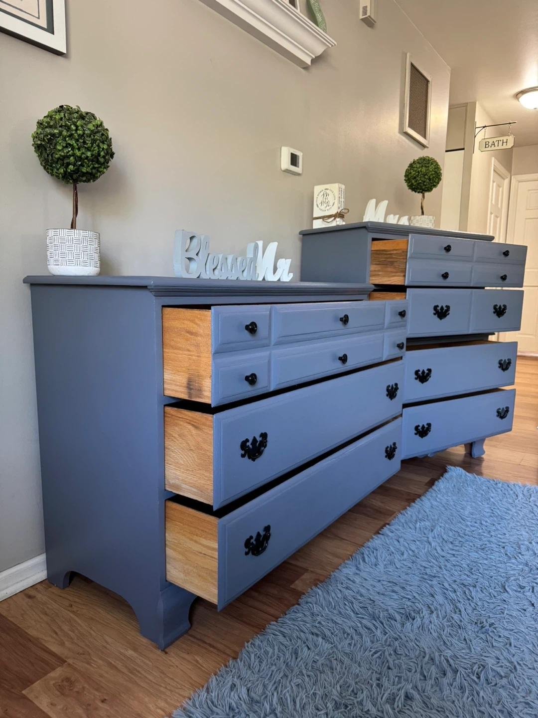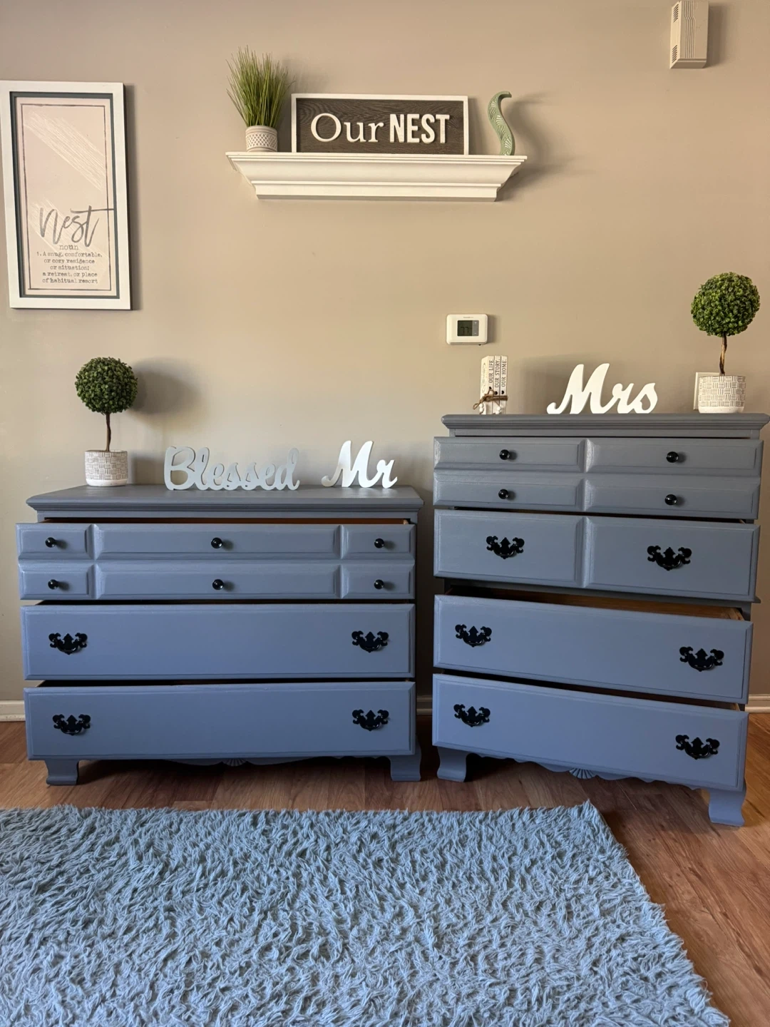 ✨Beautiful gray (can look bluish in bright light) solid refinished dresser set, solid furniture💪🏼,dovetail drawers in front & back🕊️ black hardware, all 7 drawers pull out fine on tracks, solid pieces💪🏼, Clean & sturdy! This is NOT that cheap wayfair/Ikea furniture, this will last you FOREVERR, I sell good quality furniture & my prices are still better/cheaper than a furniture store. Please don’t ask to lower my price‼️