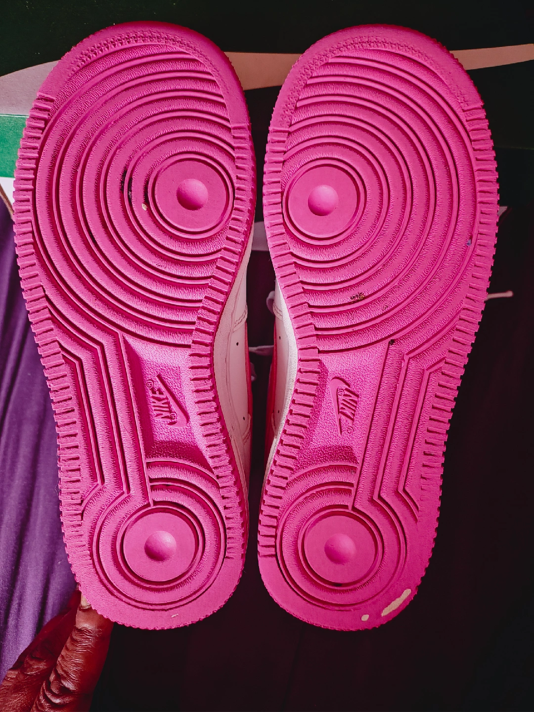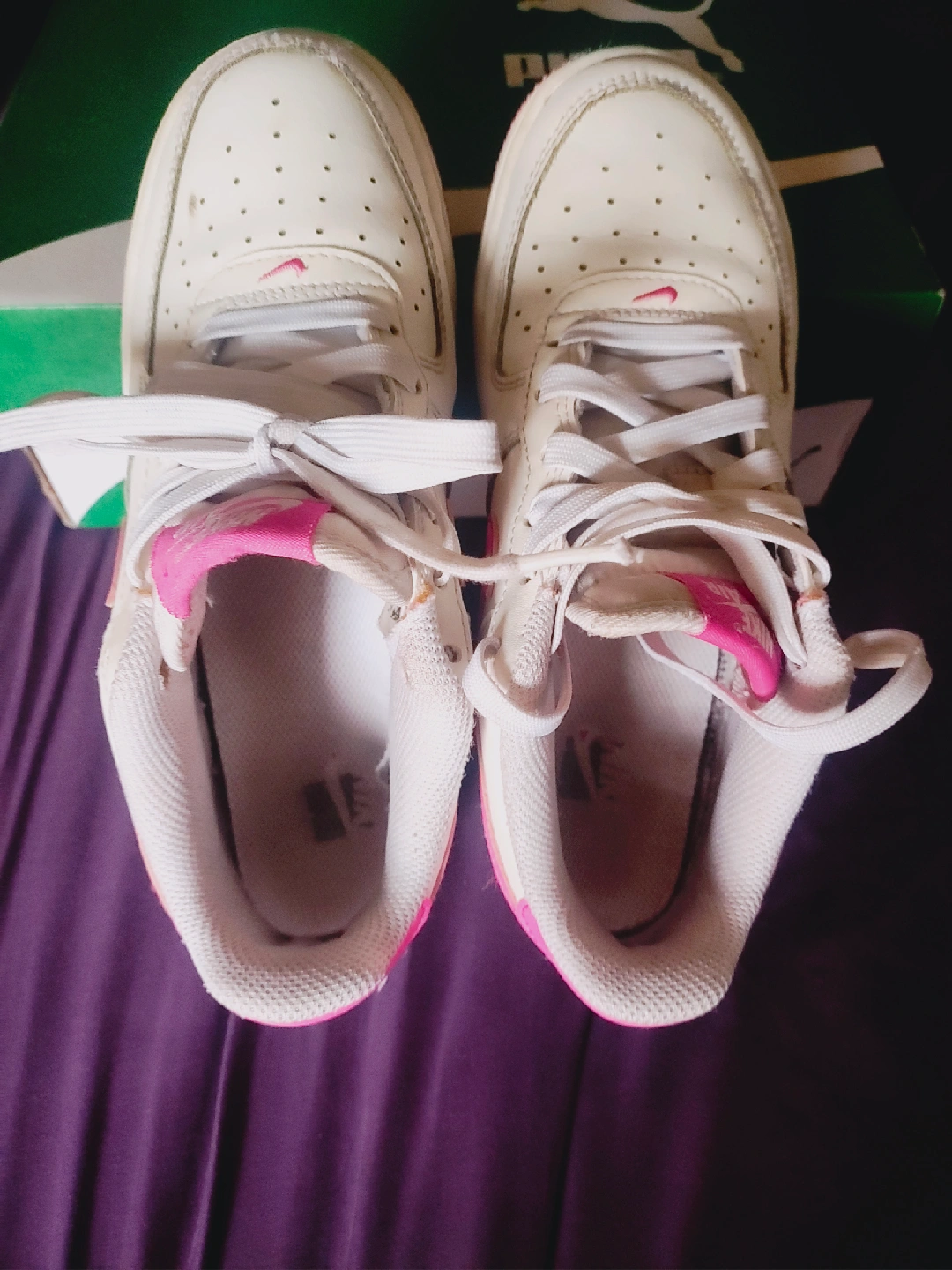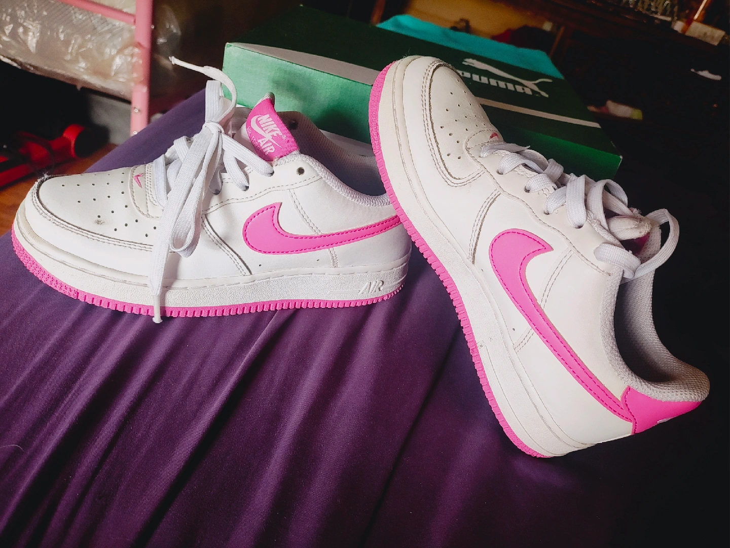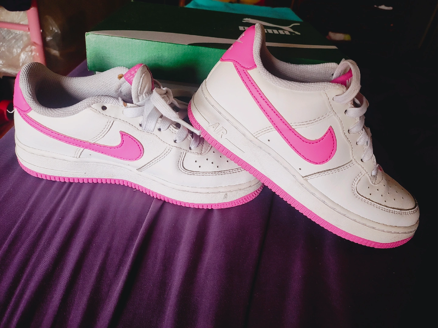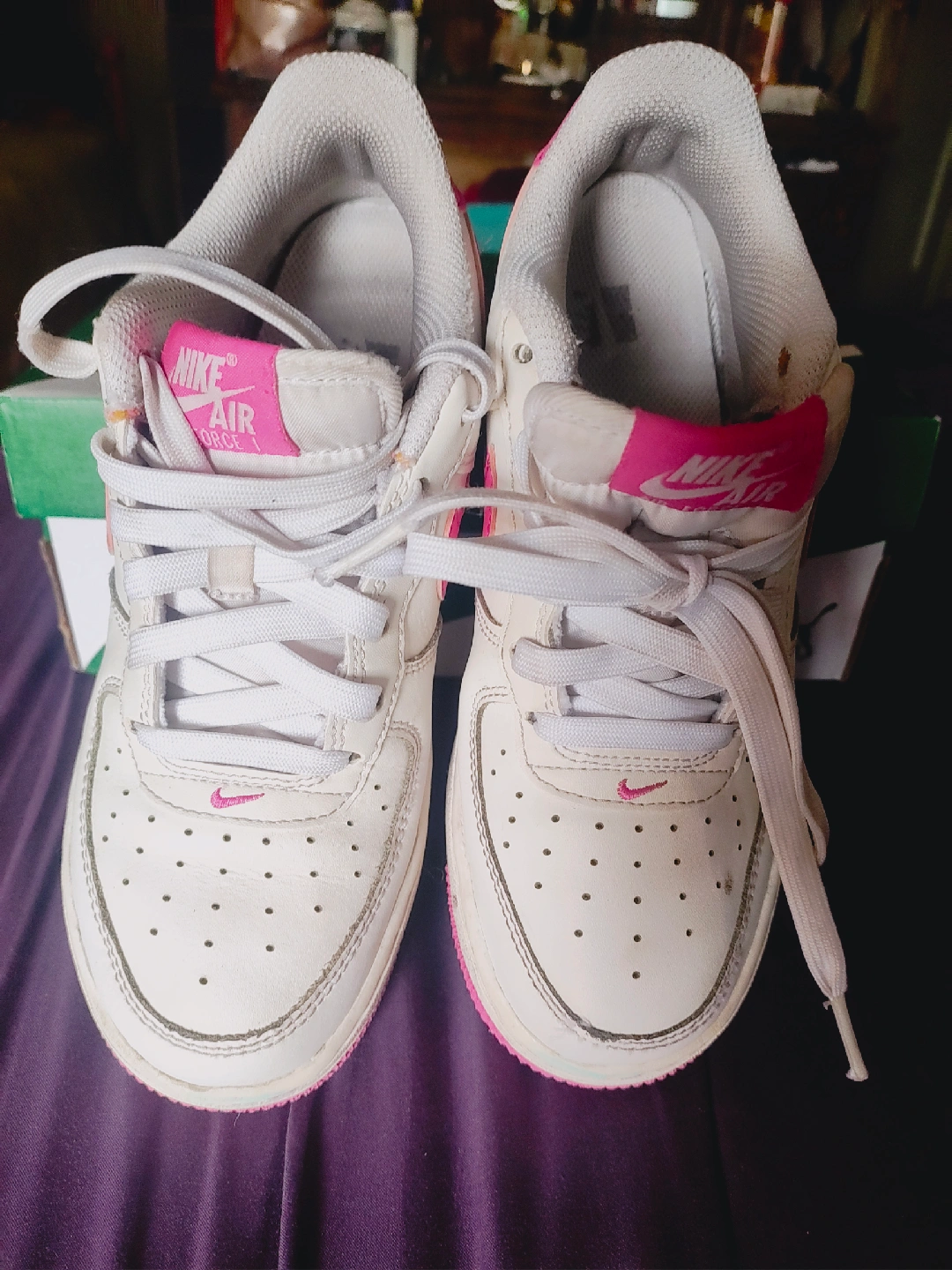 Selling a pair of Nike Air Force 1 sneakers in white and pink. They show some signs of wear, but still have lots of life left! Comes No box.