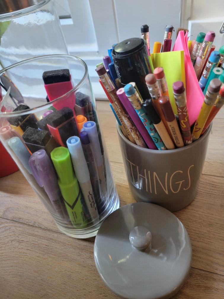 Rehoming a bunch of pens/pencil crayons + markers.