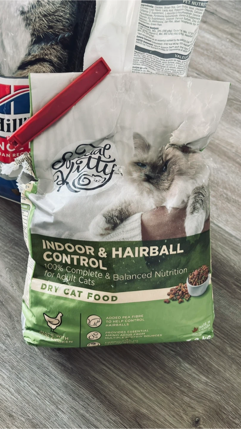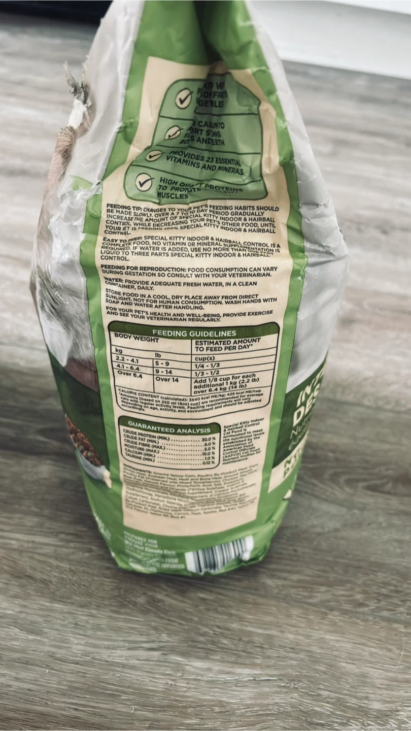 Selling a bag of Special Kitty Indoor & Hairball Control dry cat food. It's 100% complete and balanced nutrition for adult cats. Contains added pea fibre to help control hairballs and provides essential amino acids from multiple protein sources. Net weight 3.2 kg