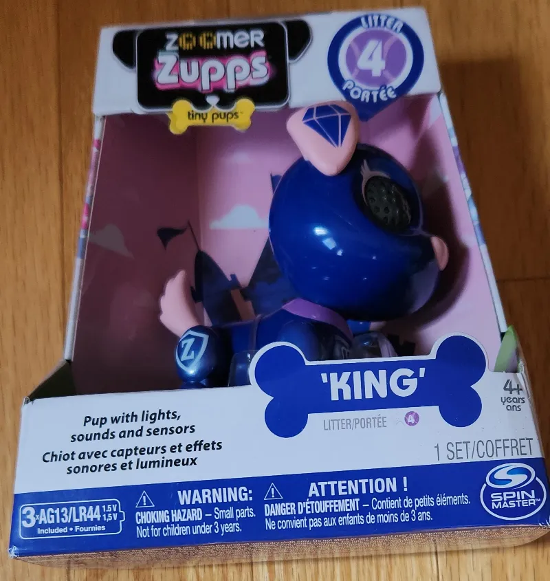 I'm selling a Zoomer Zupps Tiny Pups toy, specifically the 'King' character! This interactive pup has lights, sounds, and sensors for engaging play. It's recommended for ages 4 and up and comes in its original packaging. Perfect for little ones who love interactive toys!