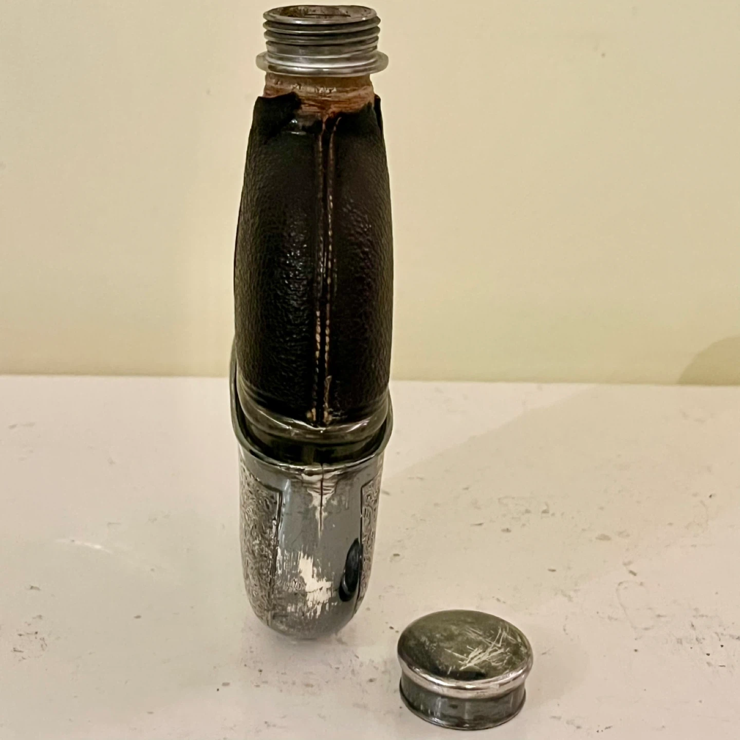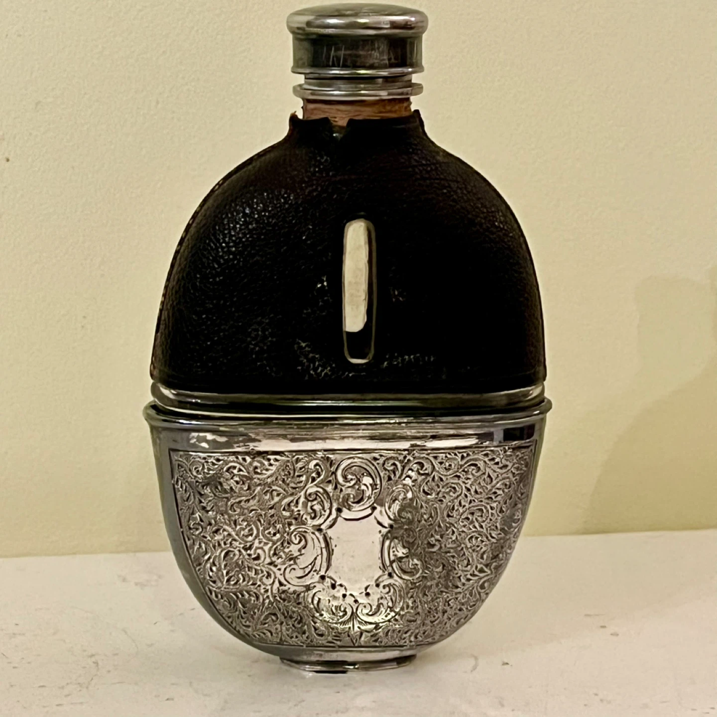 A fantastic and wonderfully designed antique Victorian silver plated, leather-bound glass hip flask with retractable stirrup cup c1880. Referred to as a “gentleman’s flask” or “hunting flask”, this would make a perfect gift or addition to any collection.