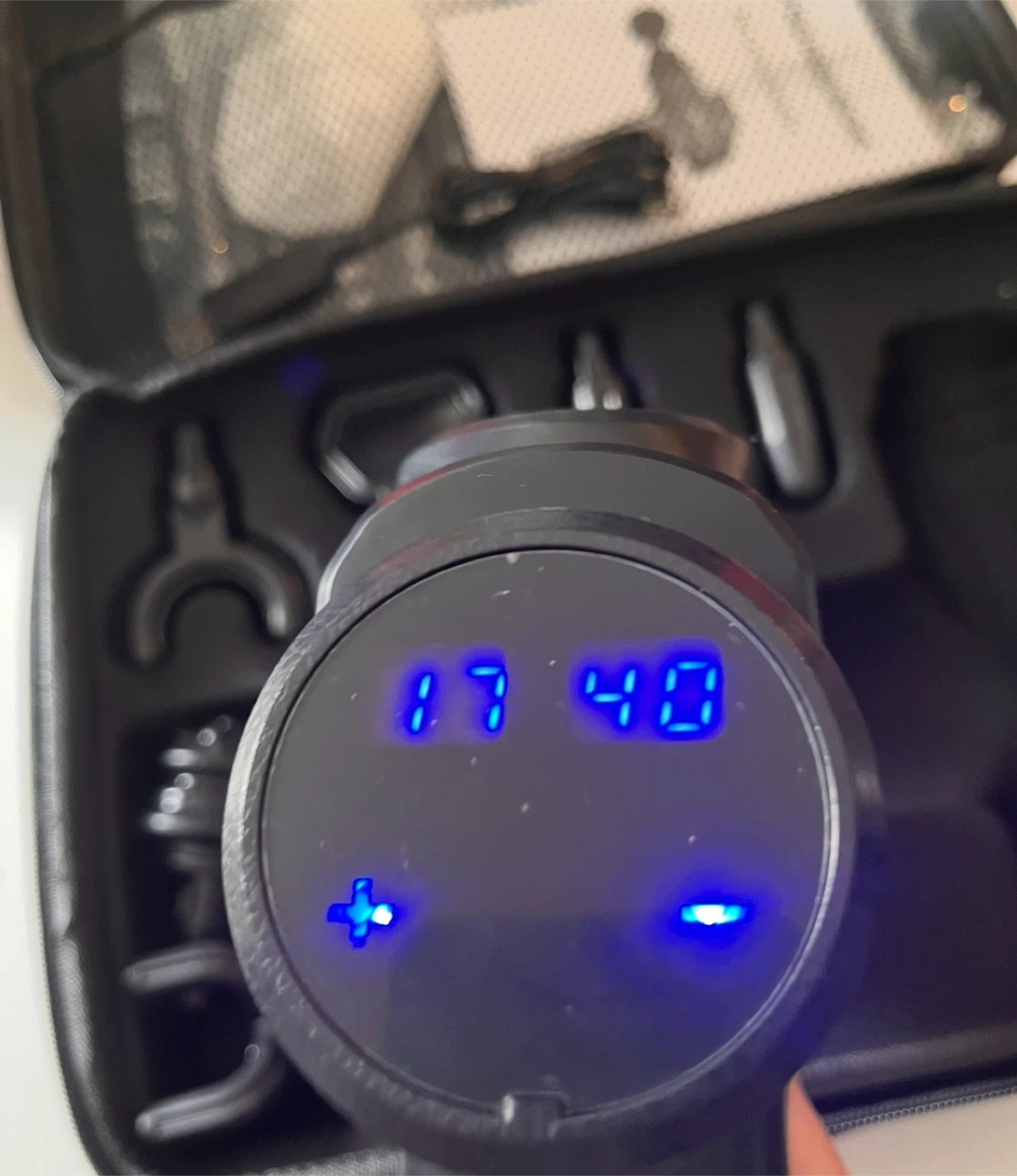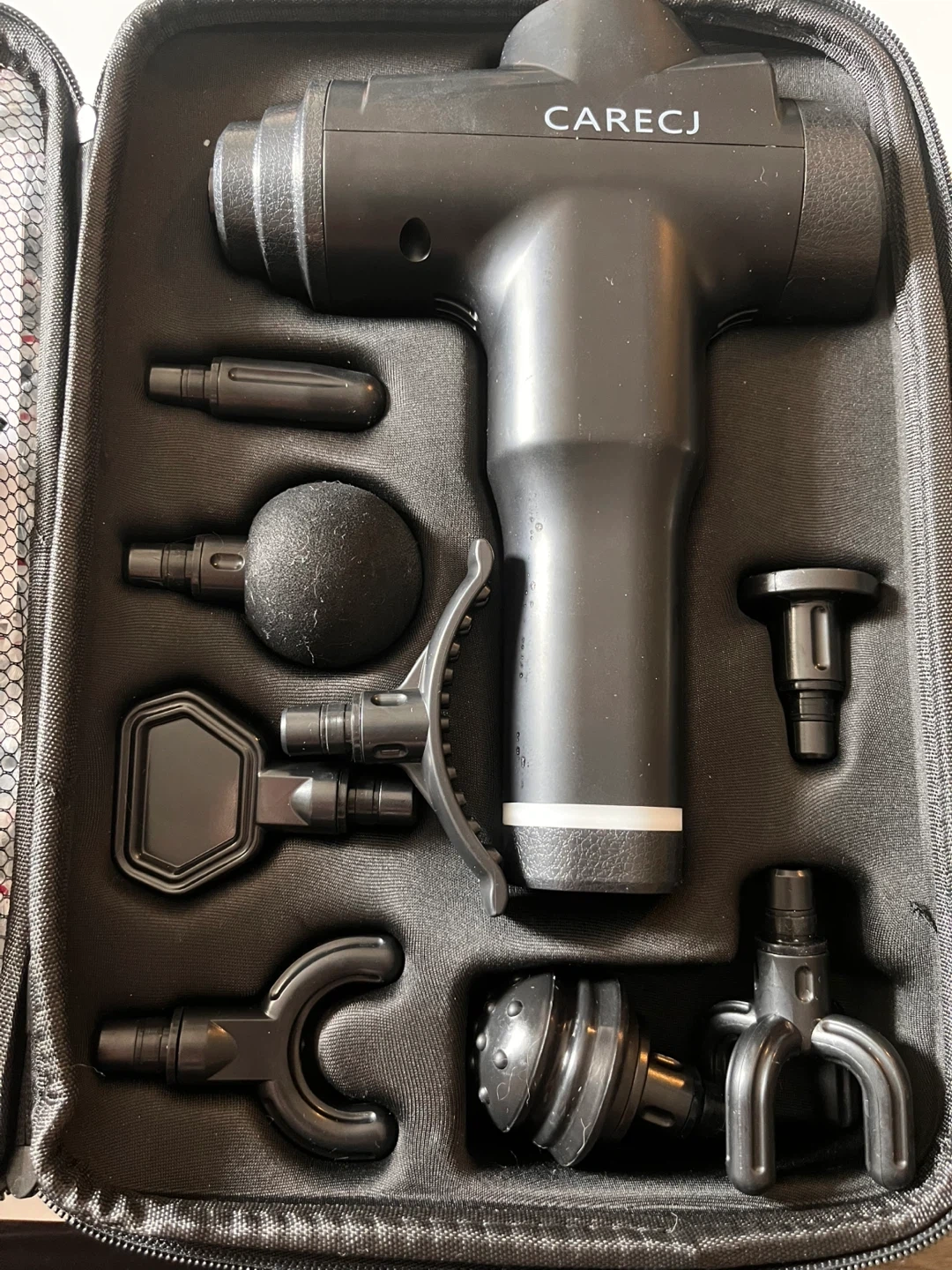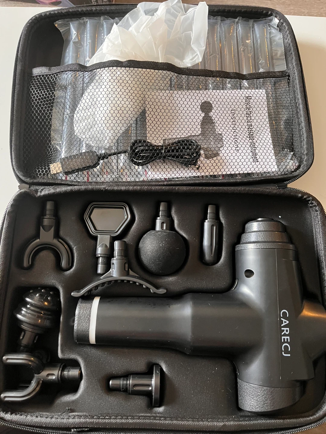 9 piece massage gun with a carrying case. Used once. USB charge. Long battery life. It's great for relieving muscle tension and soreness after a workout or a long day. The massage gun has an ergonomic grip and a digital gear indicator for easy use. It also includes an on/off power switch and instructions are included as well!