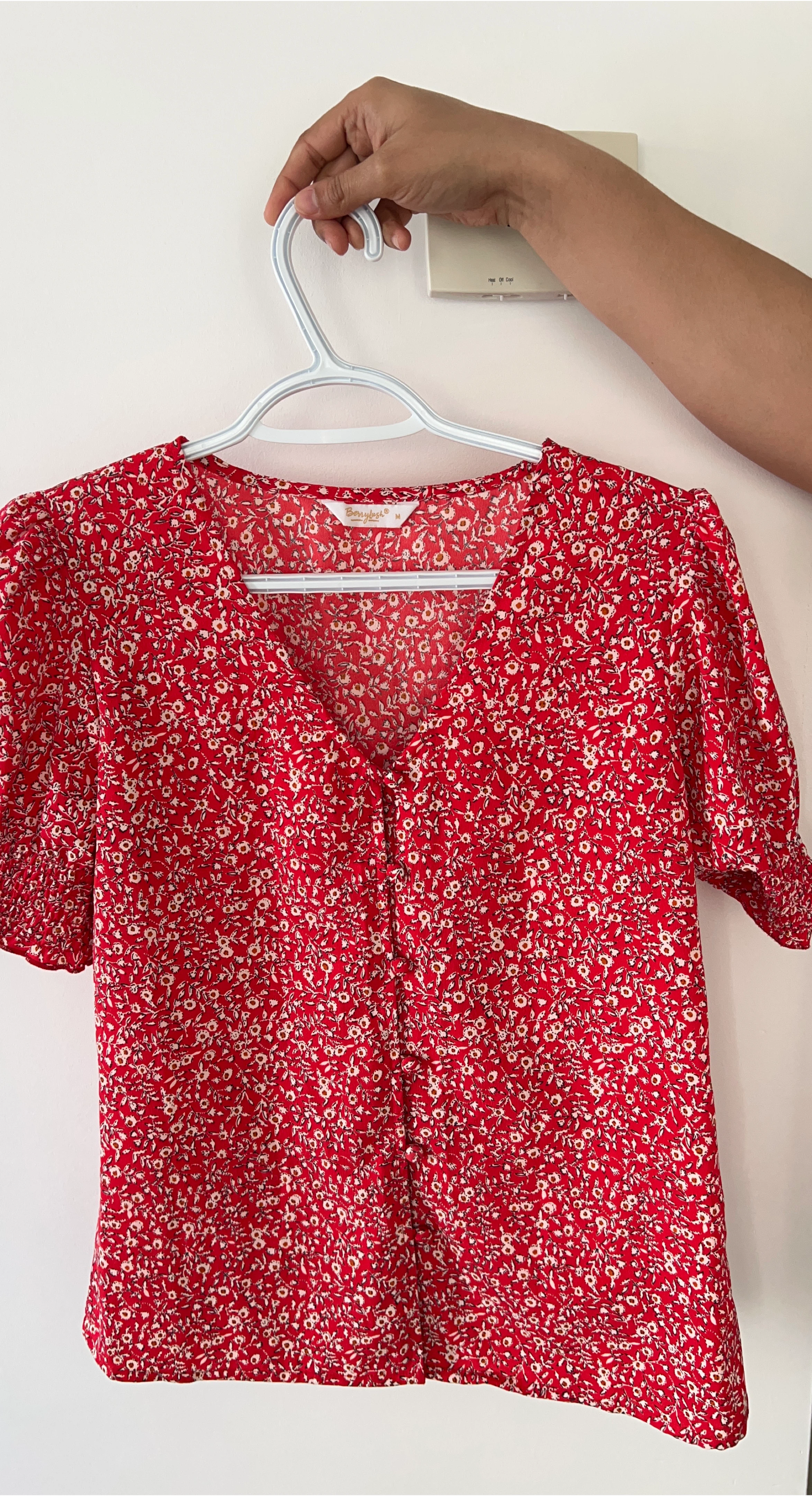 Selling a cute Berrylush blouse! It's a vibrant red with a lovely floral pattern. The size is M and it's in great condition. Perfect for adding a pop of colour to your wardrobe!
