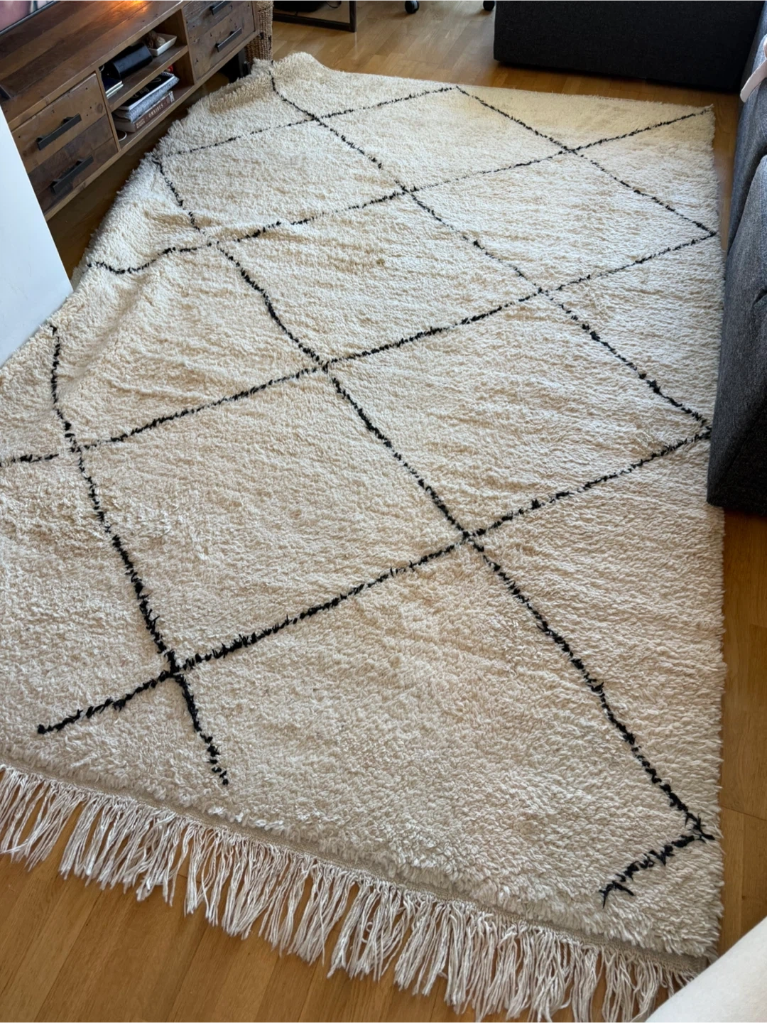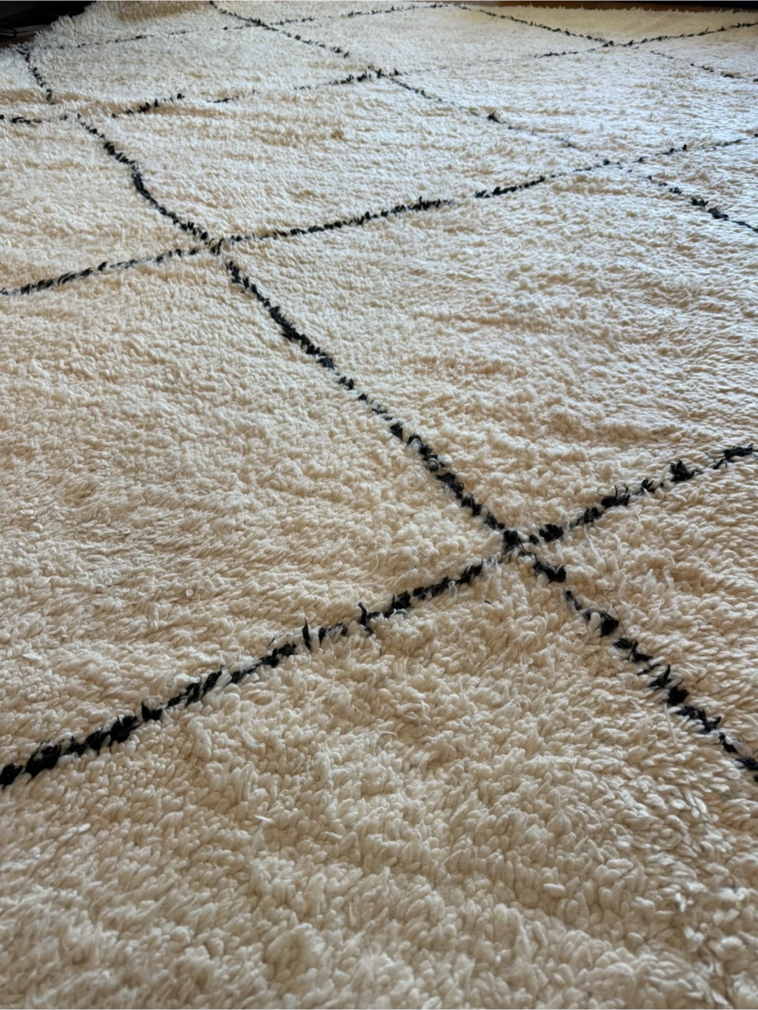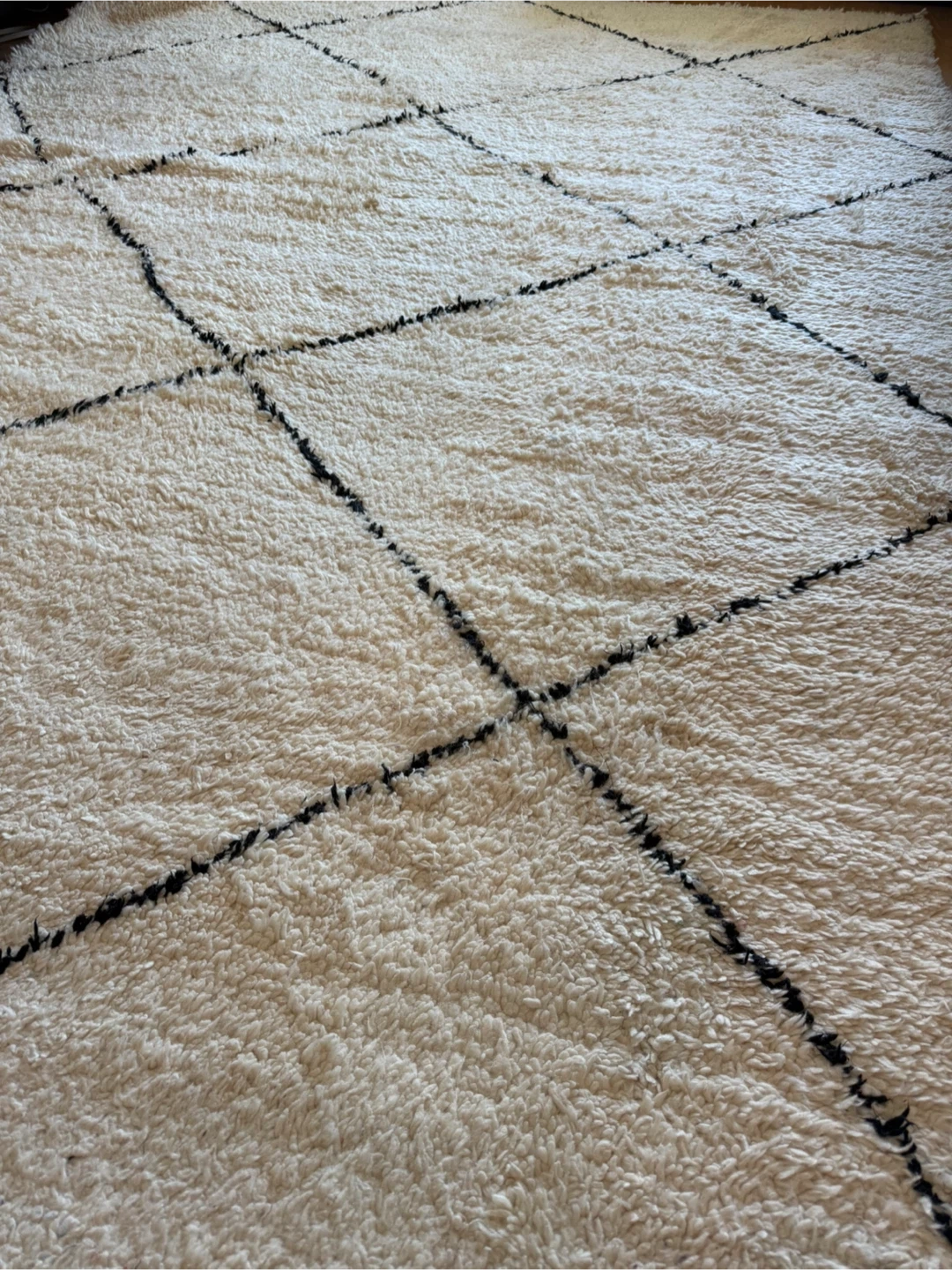 Selling a beautiful Beni Ourain style rug! It is hand woven and was purchased in the Middle East. It features a cream base with a black geometric pattern. 10.5ft x 6.75ft