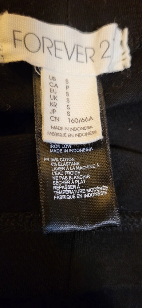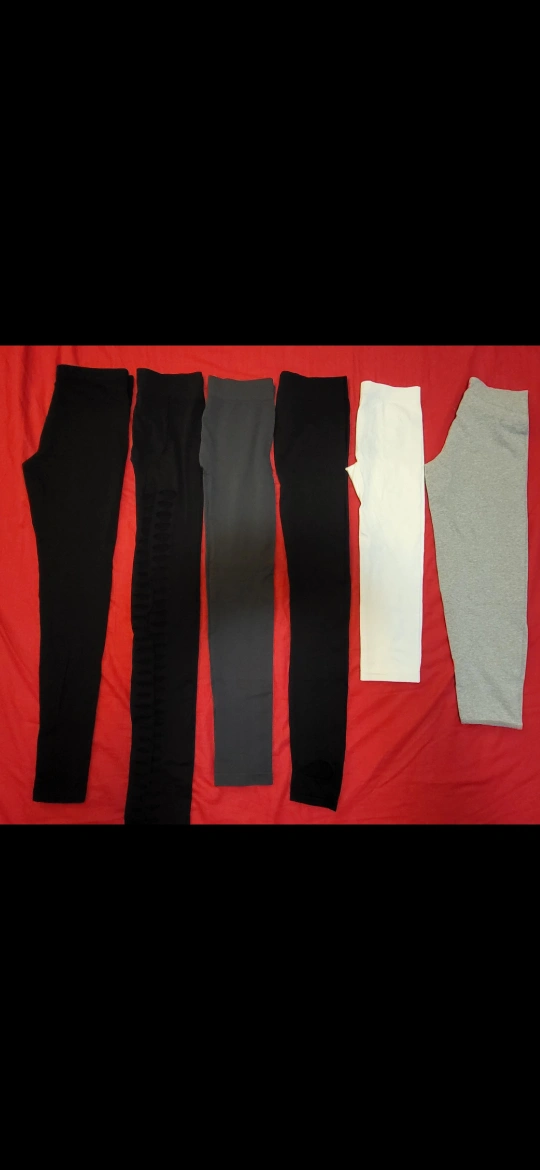 Women's leggings bundle. 6 pairs for $10. Info left to right. #1 Forever 21, size small, mainly cotton, black. #2 Seduction, size medium/large, mainly nylon, black, slashed design. #3 Anonymous, free size, mainly nylon, grey. #4 Fluo, size x small, mainly nylon, stirrups style. #5 La Senza, size small, mainly polyamide, white, cropped. #6 La Senza Candy, mainly cotton, heather grey, cropped.