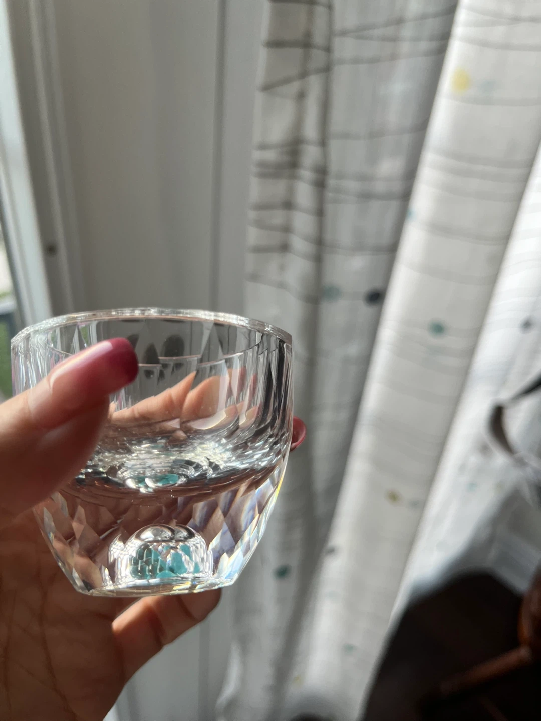Selling a clear glass cup with decorative turquoise stones at the bottom. It's in great condition and would be a lovely addition to any home!